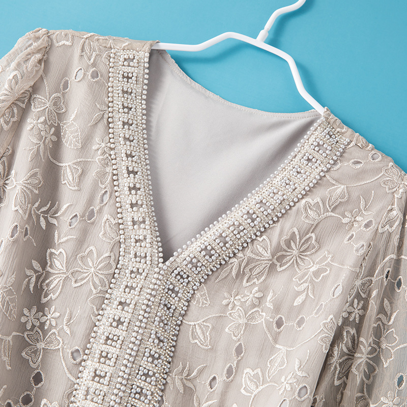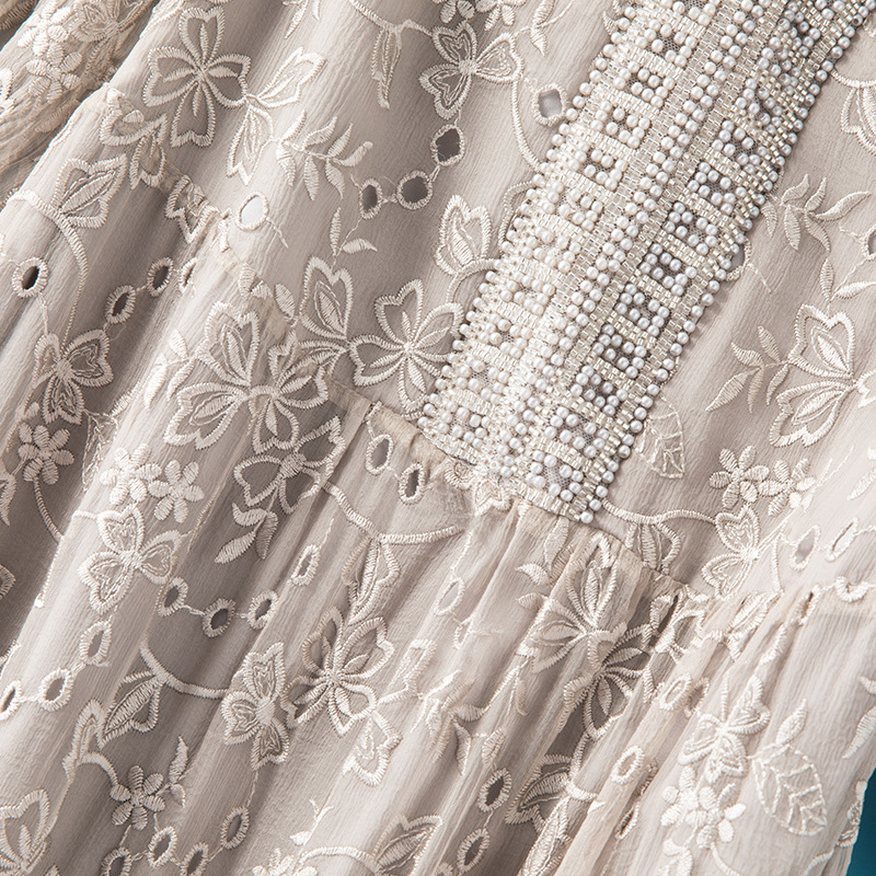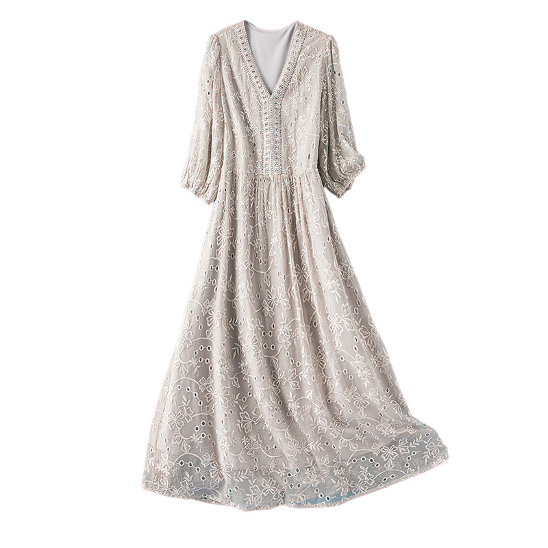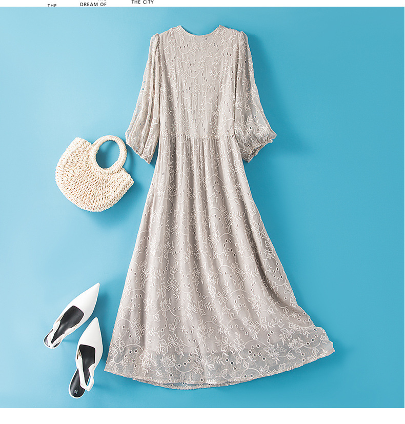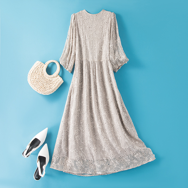 Chiếc đầm dài mang phong cách Pháp cổ điển, được làm từ chất liệu tơ lụa mềm mại và thoáng mát. Điểm nhấn là những đường thêu tinh xảo trên nền vải màu xám nhã nhặn. Thiết kế cổ chữ V giúp tôn lên vẻ thanh lịch. Sản phẩm phù hợp để mặc trong nhiều dịp khác nhau. Khi giặt, nên vò nhẹ nhàng bằng nước lạnh và phơi ở nơi râm mát để giữ chất vải được bền đẹp. | Tên sản phẩm: Váy Đầm Liền Thân Dáng Dài Nữ Chất Liệu Lụa Tơ Tằm Thêu Họa Tiết Hoa Phục Cổ Cổ Điển - Thời Trang Nữ | Mã sản phẩm: L2557 - Giá: 2.680.000đ | Mã nhà sản xuất: SHDA-G06Hình ảnh sản phẩm