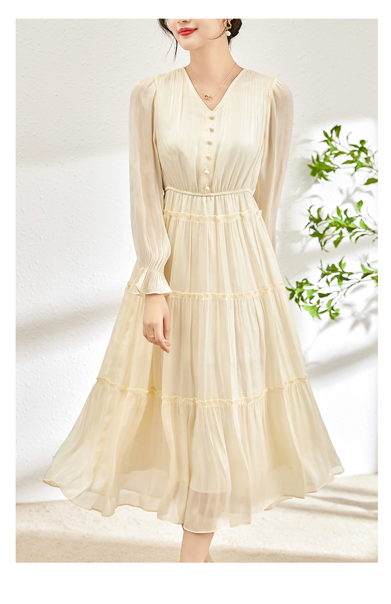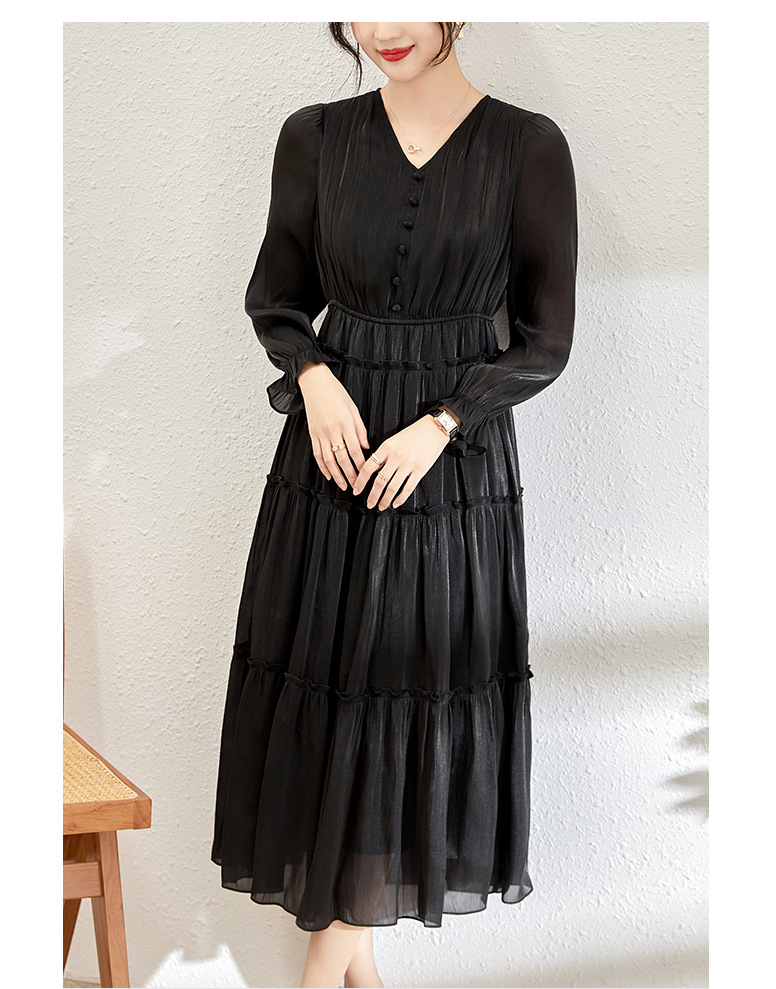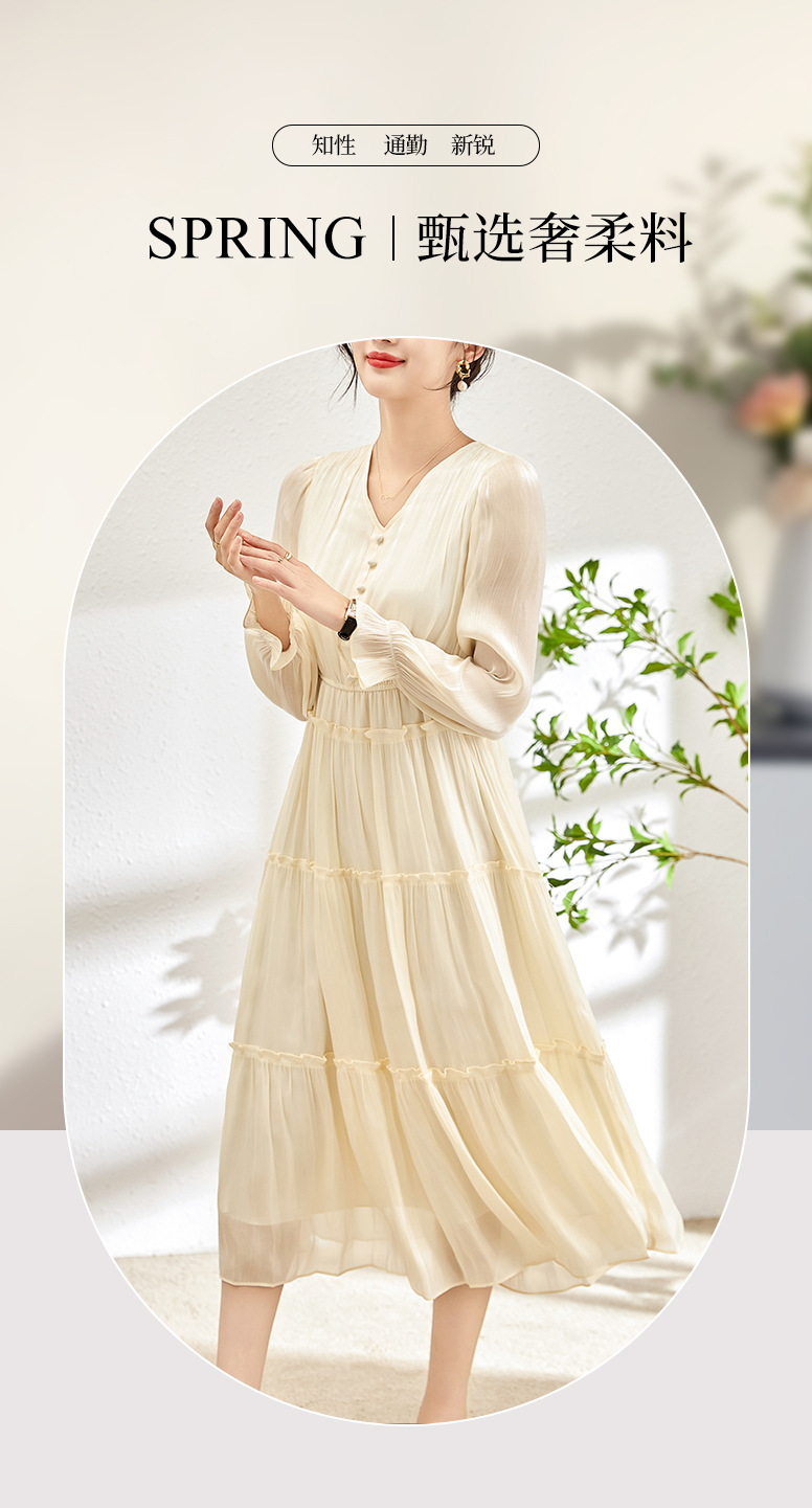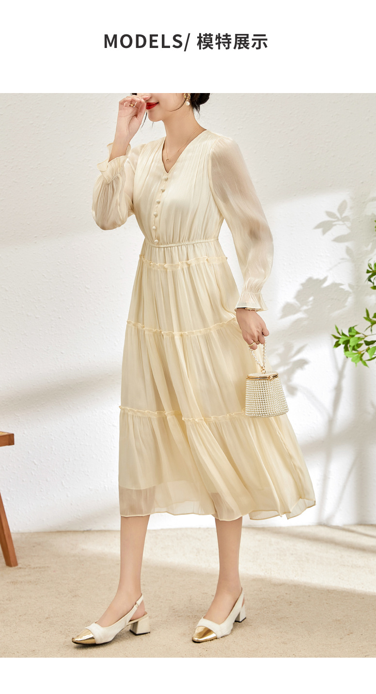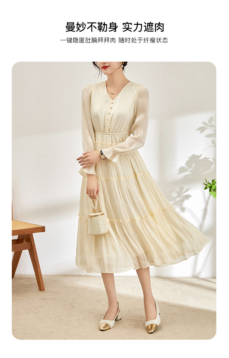 Chiếc đầm ôm dáng tôn lên những đường nét cơ thể một cách dịu dàng. Cổ chữ V giúp phần cổ trông thanh thoát hơn. Điểm nổi bật là phần viền tay và vạt áo được cách điệu như những cánh sen, tạo nét duyên dáng. Chất vải mỏng nhẹ có ánh ngọc tr lấp lánh dưới ánh đèn. Mặc kèm áo khoác mỏng hoặc phụ kiện đơn giản để phù hợp cho nhiều dịp. | Tên sản phẩm: Váy Đầm Liền Thân Nữ Cổ Chữ V - Thời Trang Nữ | Mã sản phẩm: L2623 - Giá: 2.060.000đ | Mã nhà sản xuất: SHDY-G05Hình ảnh sản phẩm
