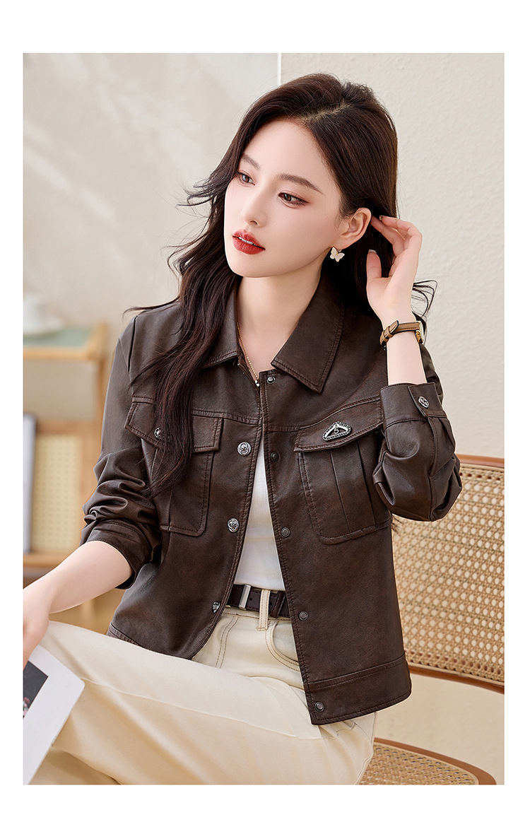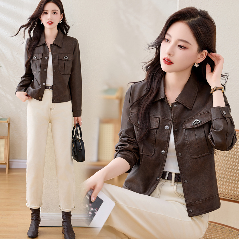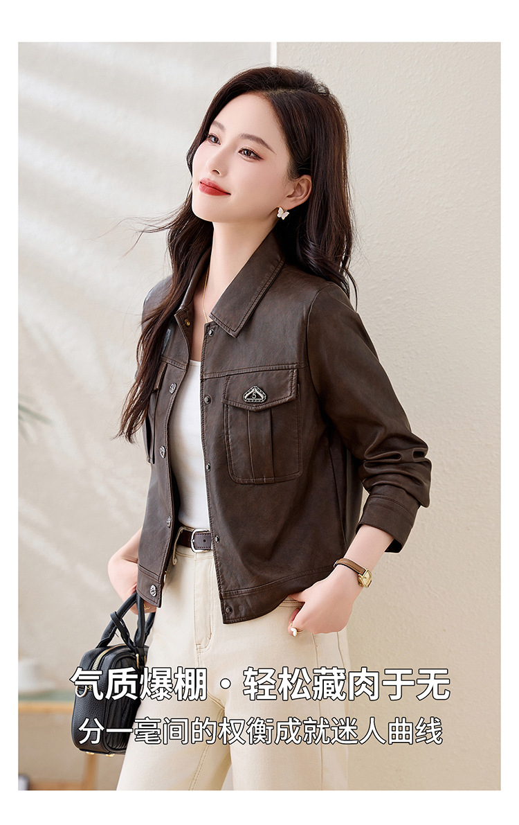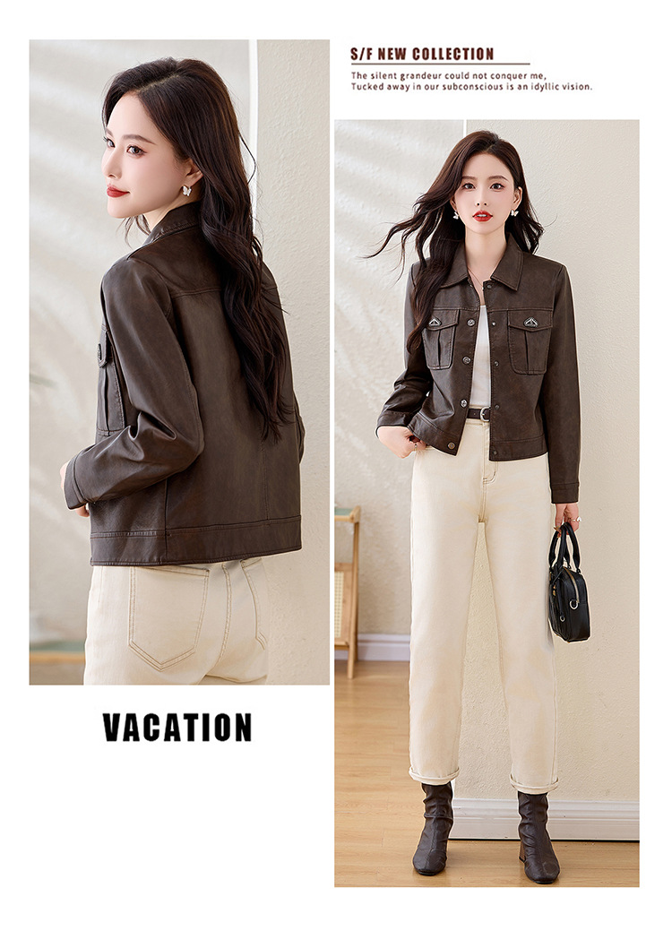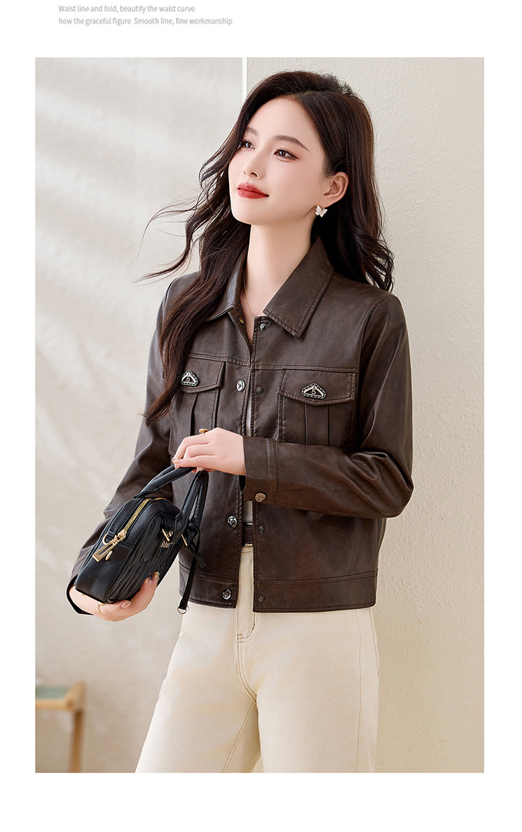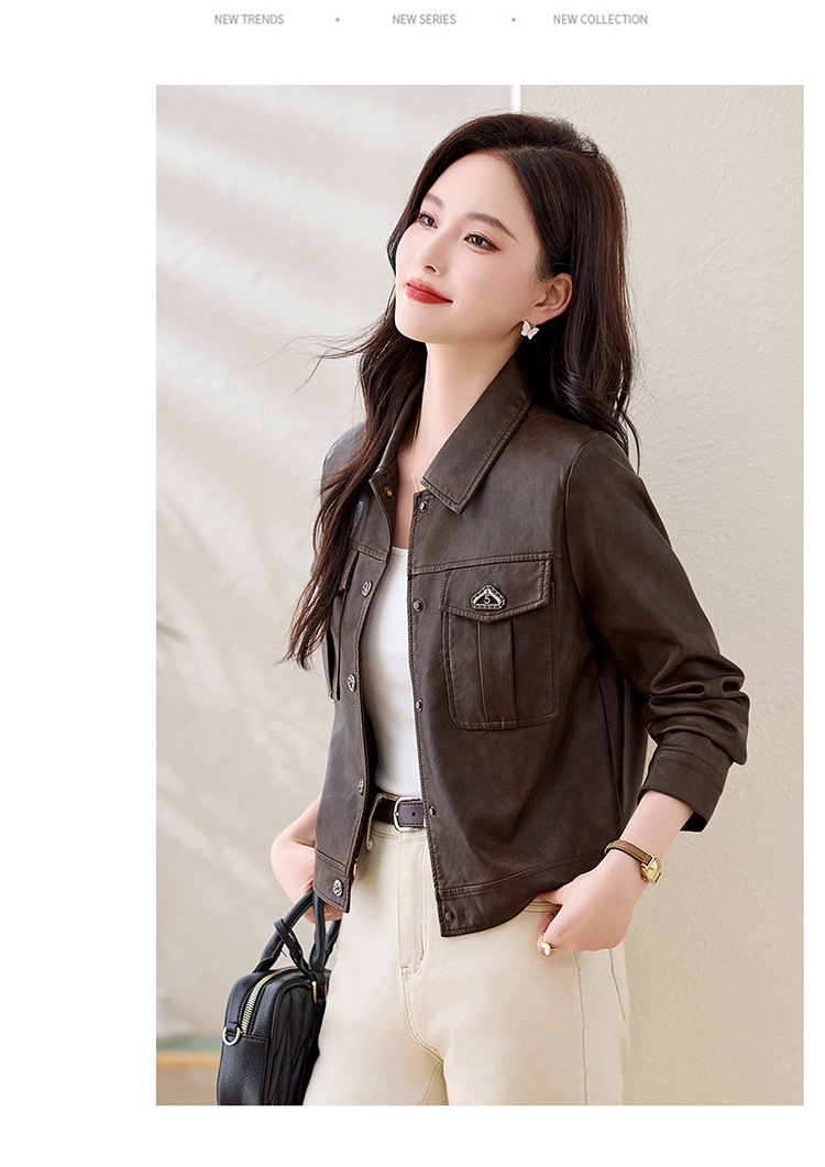 Áo khoác da ngắn dành cho nữ, có màu nâu ấm áp. Kiểu dáng thiết kế gọn gàng, phù hợp cho những người có vóc dáng nhỏ nhắn. Chất liệu da mềm mang đến cảm giác dễ chịu khi mặc. Sản phẩm mang phong cách cổ điển pha chút hiện đại, dễ dàng phối cùng nhiều loại trang phục khác nhau như quần jeans hay váy. Sử dụng hàng ngày, lau sạch bằng khăn mềm khi bám bụi để giữ vẻ ngoài luôn tươi mới. | Tên sản phẩm: Áo Da Nữ Hàng Mùa Xuân Thu Đông Phục Cổ Cổ Điển - Thời Trang Nữ | Mã sản phẩm: L3931 - Giá: 1.680.000đ | Mã nhà sản xuất: WODIG-G05Hình ảnh sản phẩm