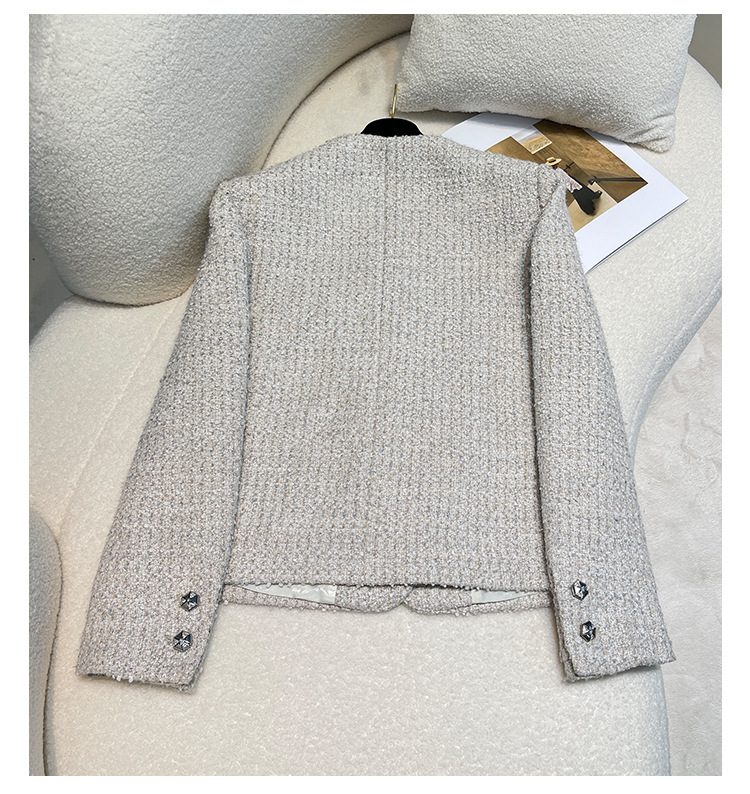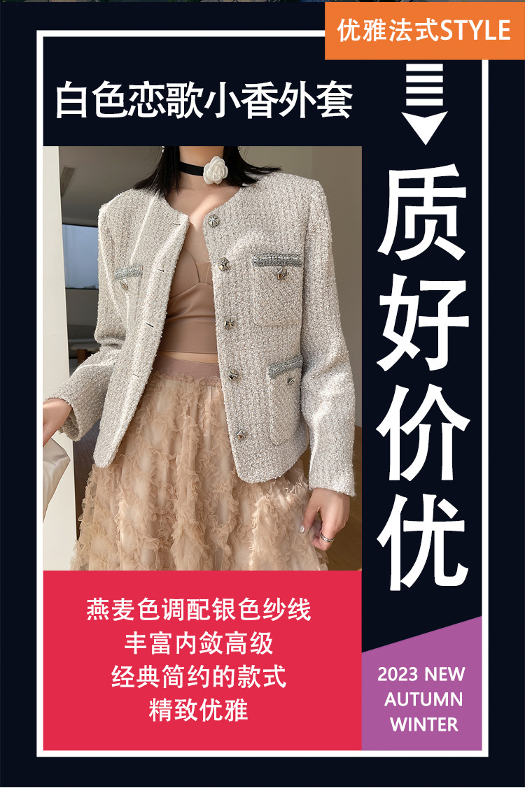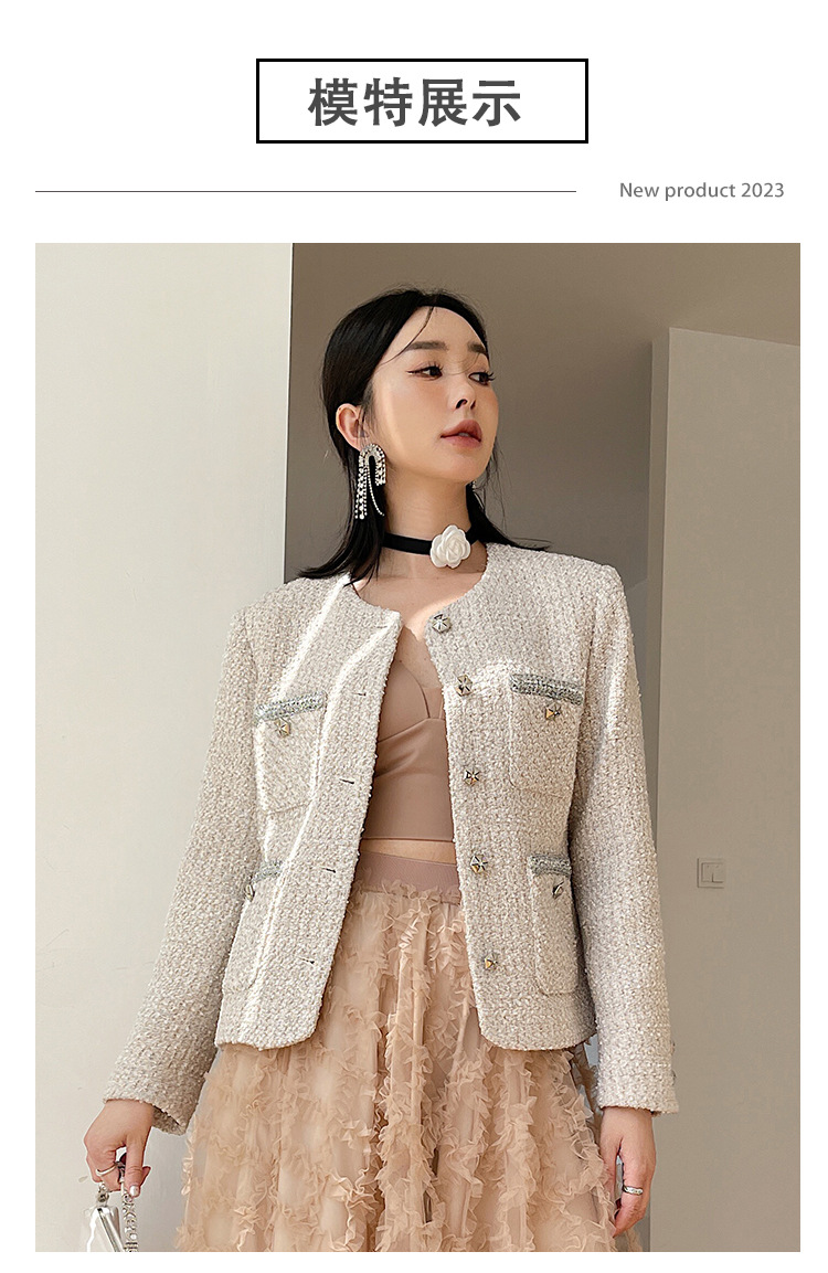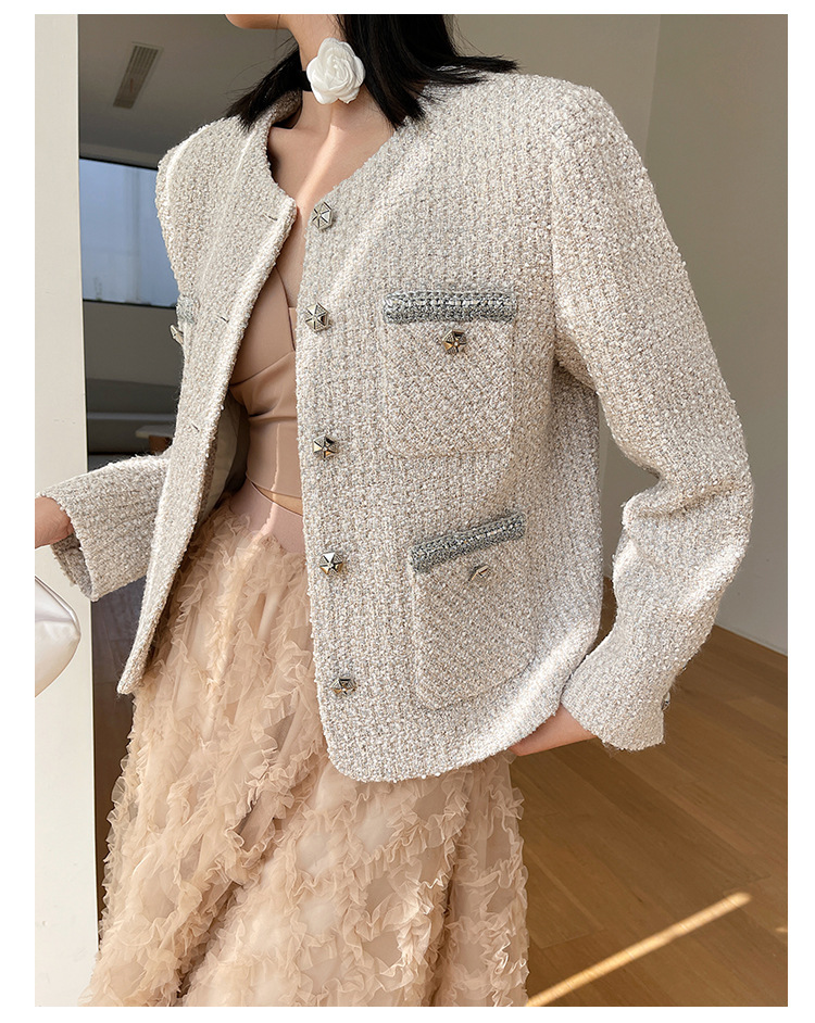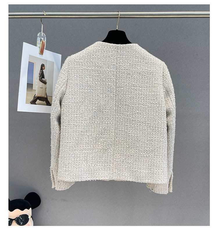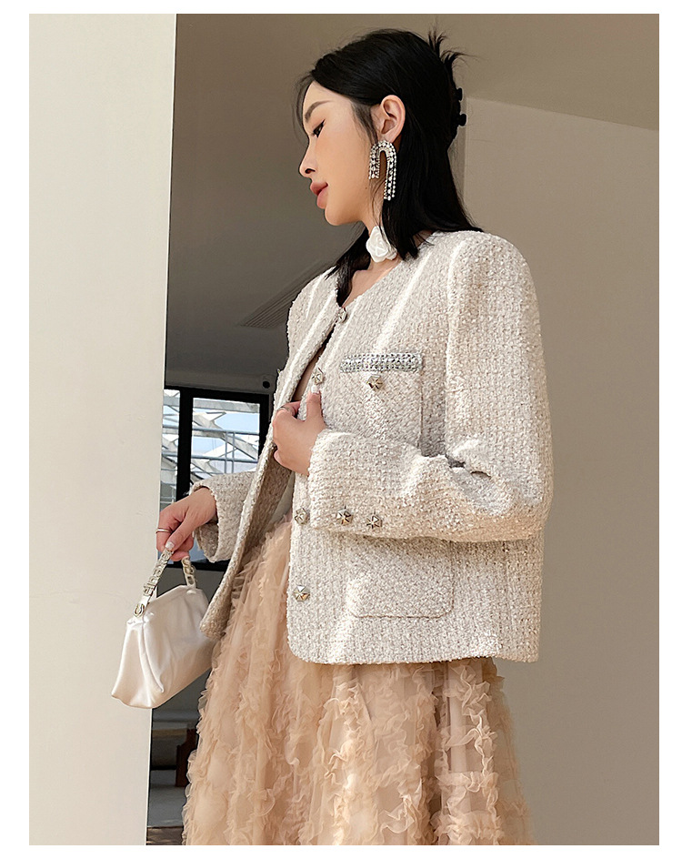 Áo khoác nữ dáng ngắn, kiểu dáng cổ tròn thanh lịch lấy cảm hứng từ phong cách thiết kế Pháp. Chất liệu dệt thô màu vàng ngà nhẹ nhàng, tạo vẻ ngoại hình ảnh dịu dàng. Họa tiết vải kết hợp nhiều sợi đan xen tinh tế, mang đến sự mềm mại và ấm áp vừa phải. Dễ dàng phối cùng áo thun bên trong và quần dài cho những ngày thu se lạnh. Sản phẩm thích hợp cho các dịp gặp mặt hằng ngày, tôn vinh nét duyên dáng giản dị của người mặc. | Tên sản phẩm: Áo Khoác Nữ Họa Tiết Hoa Hàng Mùa Xuân Thu Đông - Thời Trang Nữ | Mã sản phẩm: T1846 - Giá: 2.600.000đ | Mã nhà sản xuất: SUDA-G06Hình ảnh sản phẩm