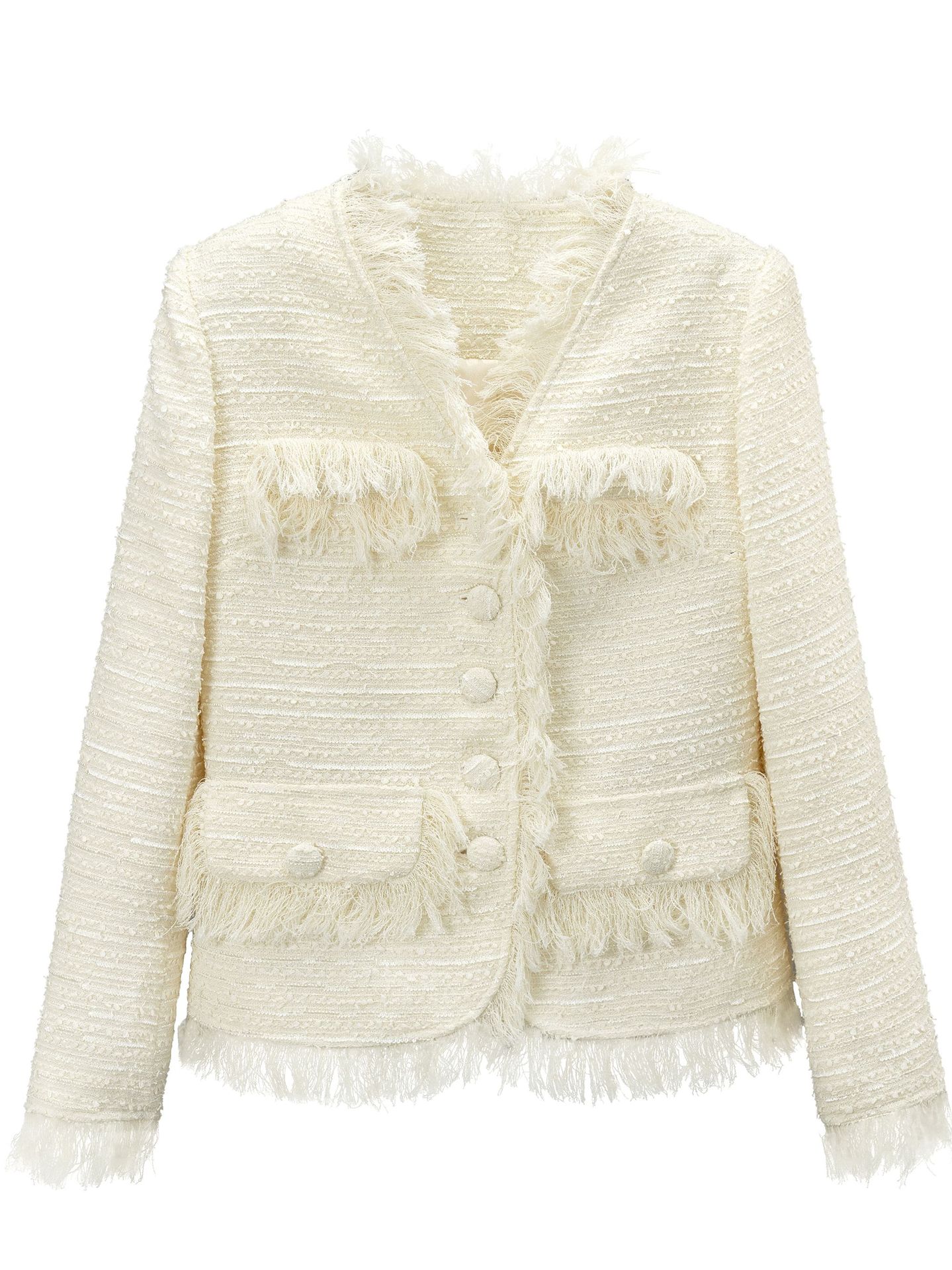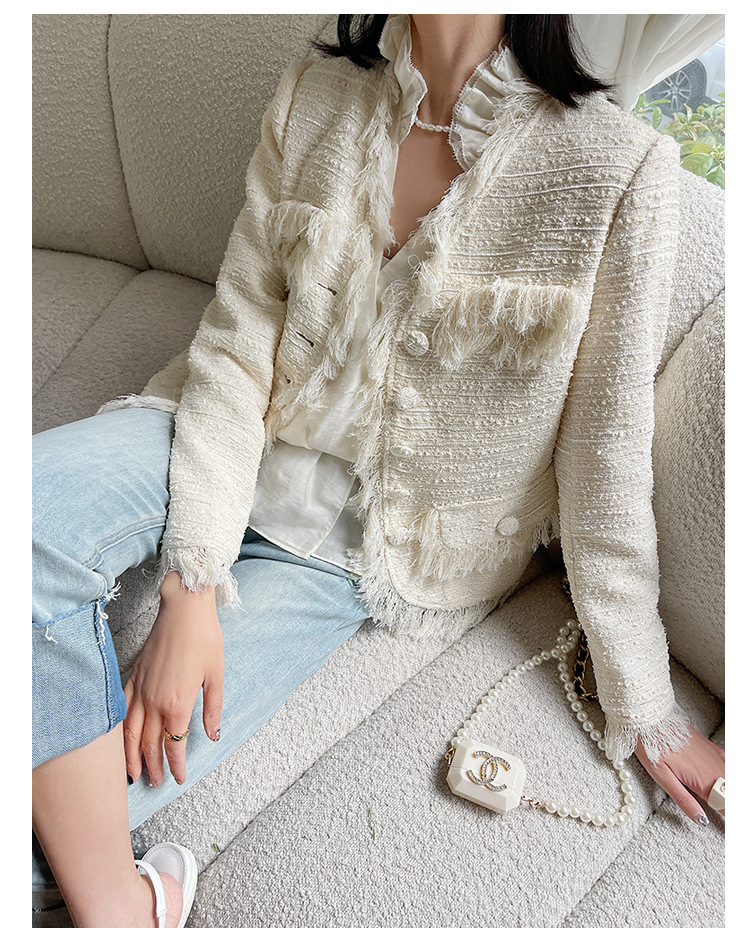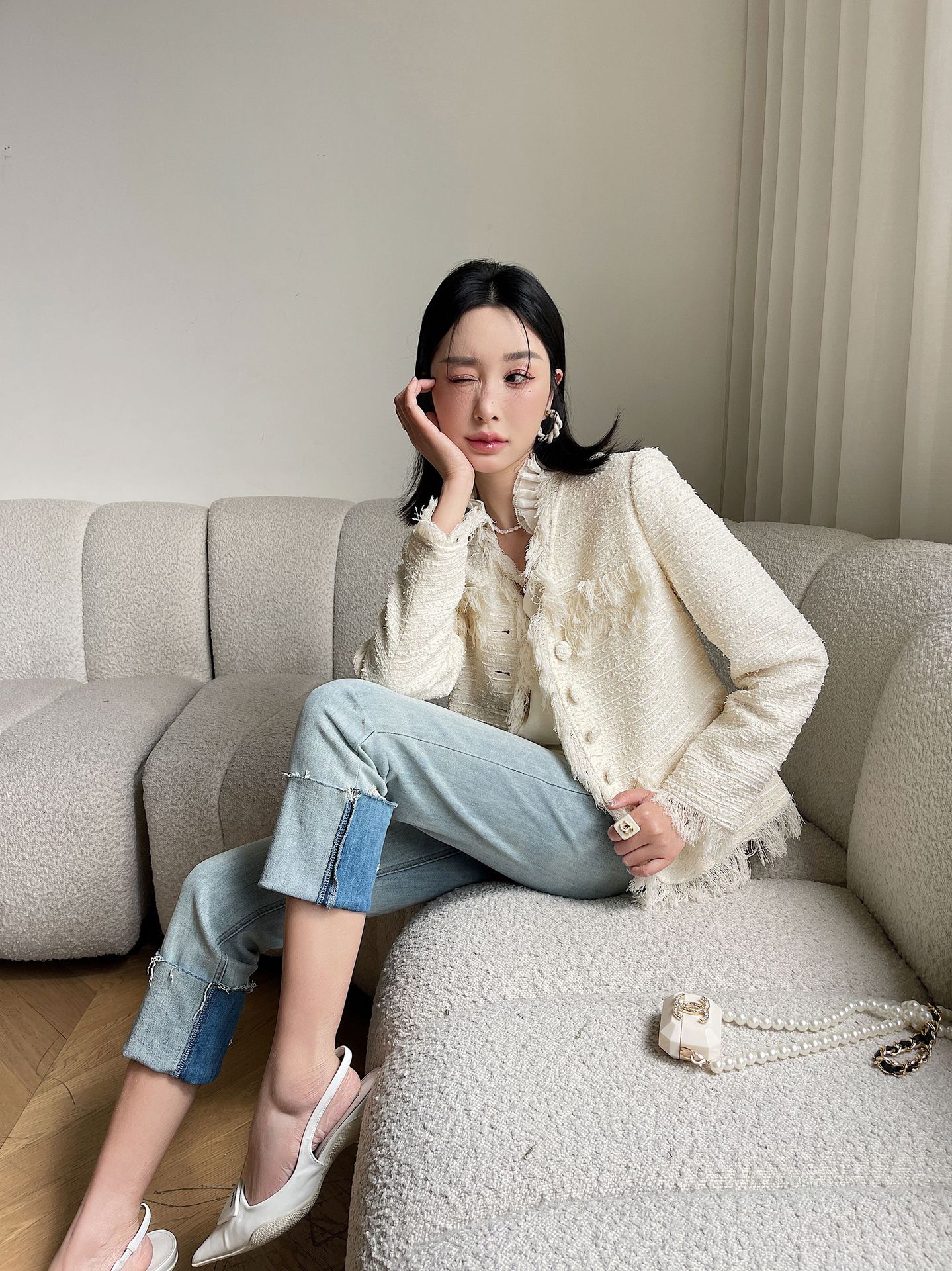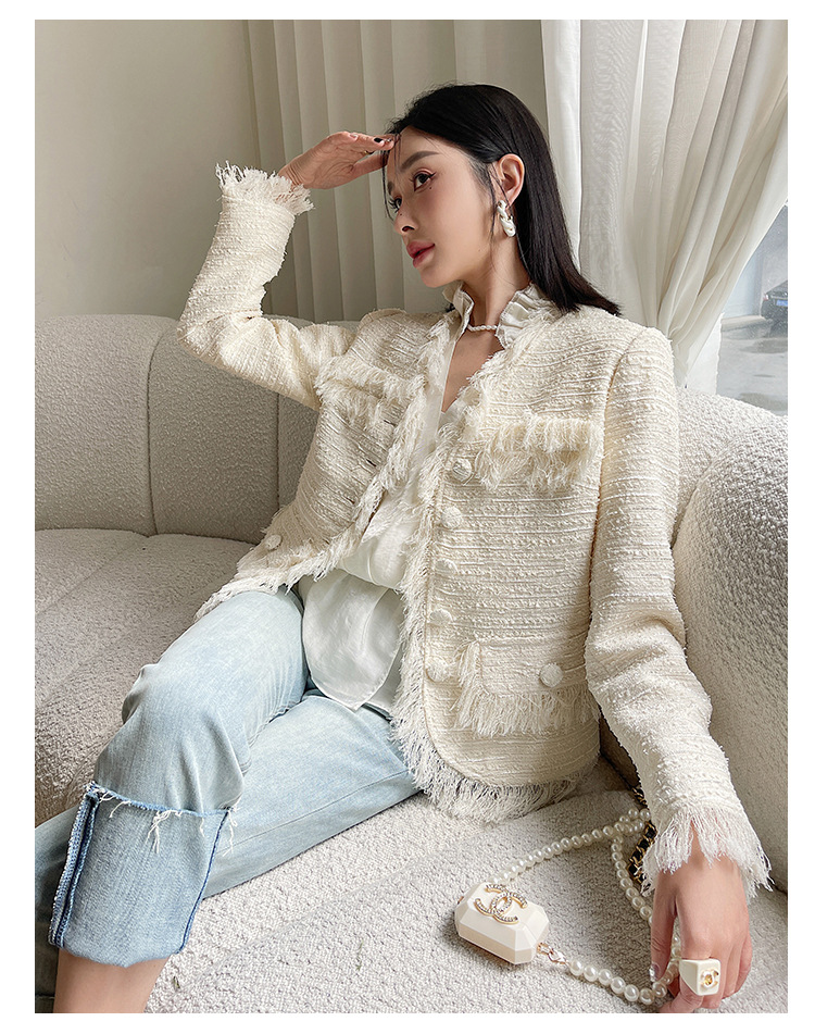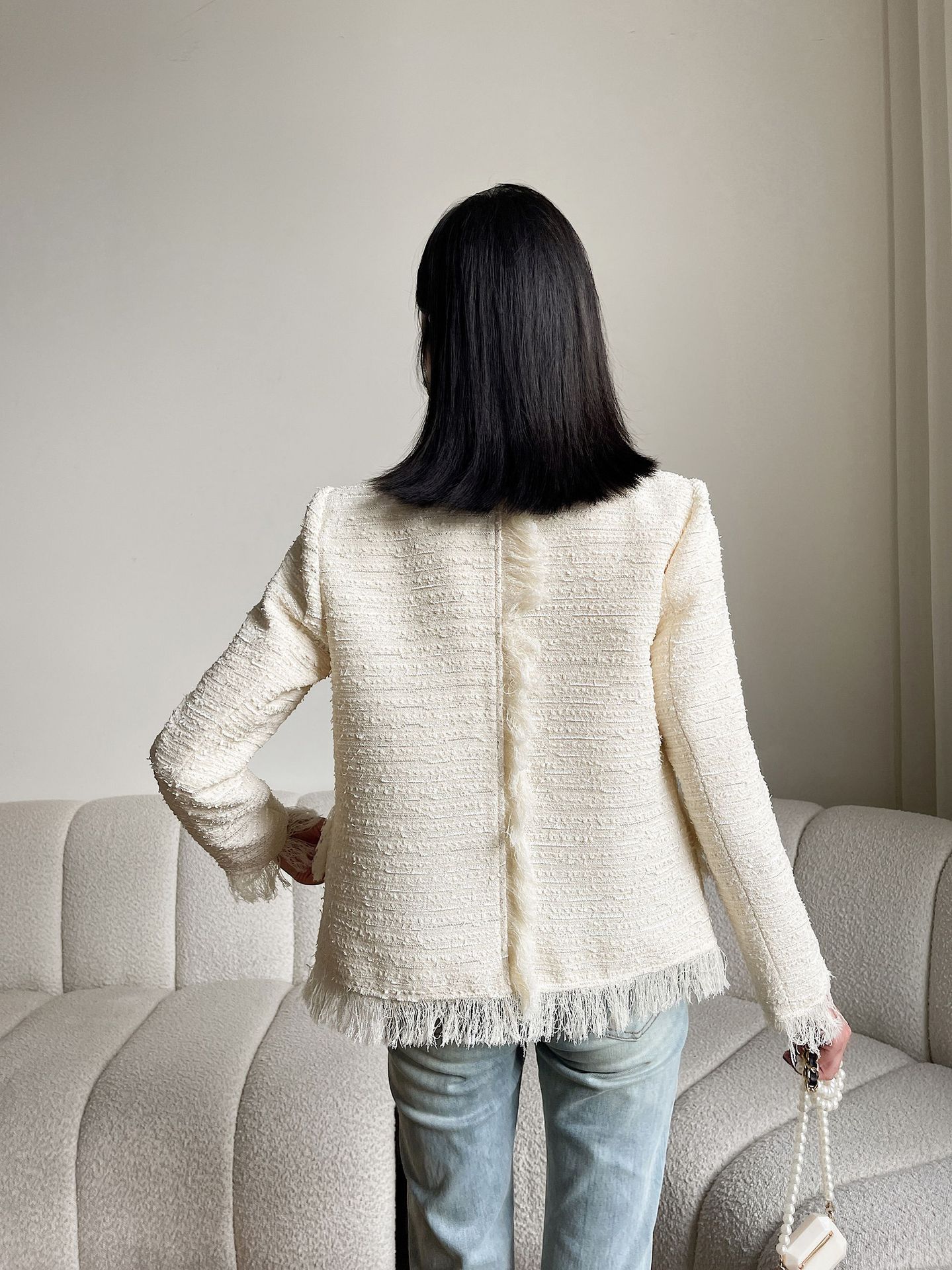 Áo khoác nữ kiểu dáng Pháp, điểm nhấn từ chất dệt thô kết hợp đường viền tua rua mềm mại. Thiết kế cổ chữ V tôn dáng, màu trắng dễ phối đồ. Sản phẩm phù hợp cho tiết thu đông, mặc cùng quần tây hoặc chân váy đều thanh lịch. Chỉ cần giặt nhẹ và phơi khô tự nhiên để giữ form áo và chất vải bền đẹp theo thời gian. | Tên sản phẩm: Áo Khoác Nữ Họa Tiết Hoa Cổ Chữ V Hàng Mùa Xuân Thu Đông - Thời Trang Nữ | Mã sản phẩm: T2772 - Giá: 1.920.000đ | Mã nhà sản xuất: SUDA-G05Hình ảnh sản phẩm