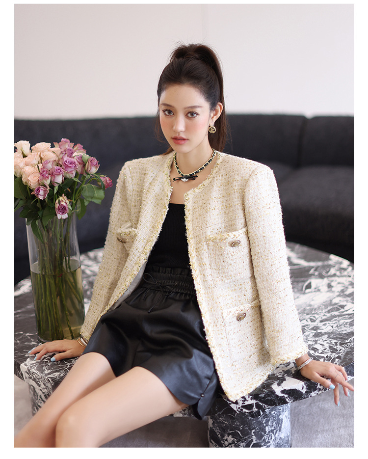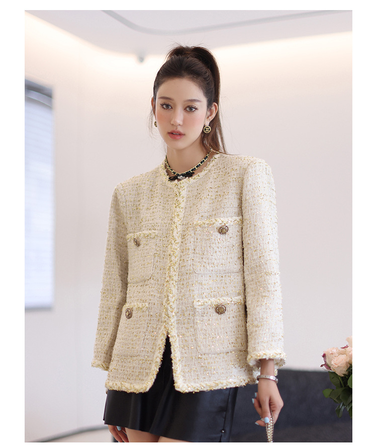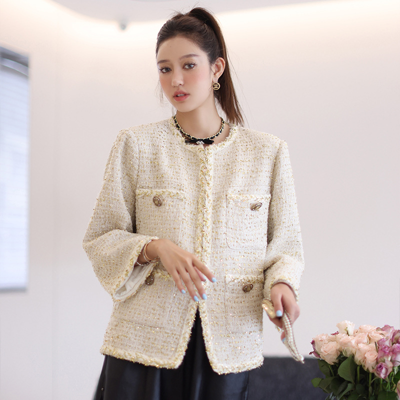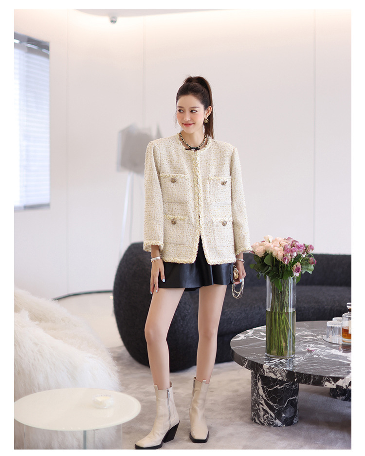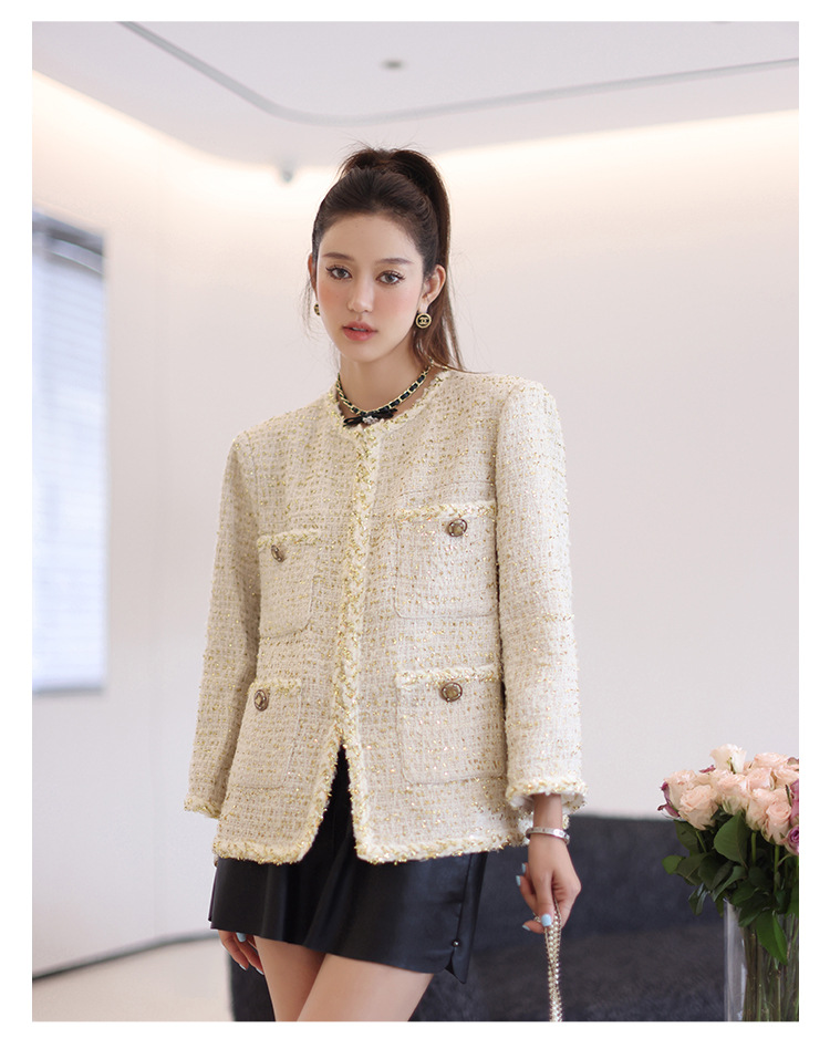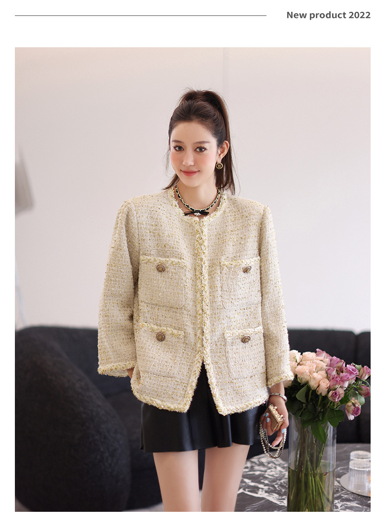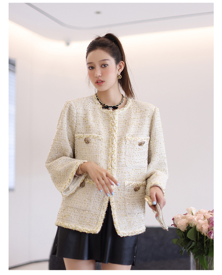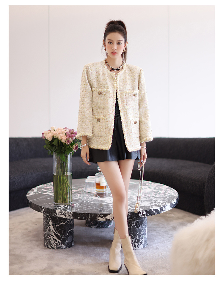 Áo khoác kiểu dáng ngắn, cổ tròn, phù hợp cho mùa thu. Chất liệu vải mềm mại, thoải mái khi mặc. Điểm nhấn là những chi tiết hạt lấp lánh tinh tế trên nền áo, tạo nên vẻ đẹp nhẹ nhàng, nữ tính. Kiểu dáng này dễ dàng phối cùng quần tây hoặc chân váy. Sản phẩm mang đến một diện mạo thanh lịch, phù hợp cho nhiều dịp trong ngày. | Tên sản phẩm: Áo Khoác Nữ Hàng Mùa Xuân Thu Đông - Thời Trang Nữ | Mã sản phẩm: T2852 - Giá: 2.600.000đ | Mã nhà sản xuất: SUDA-G06Hình ảnh sản phẩm