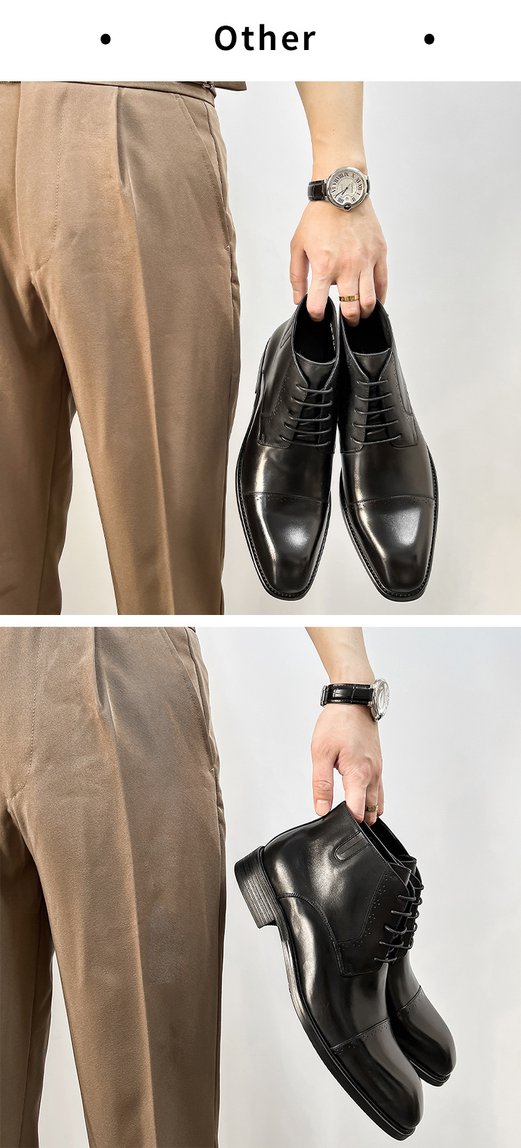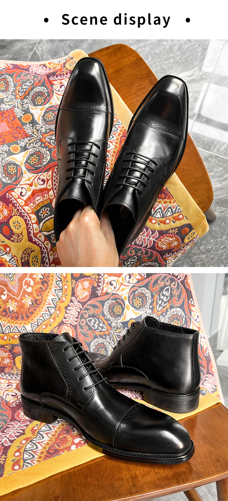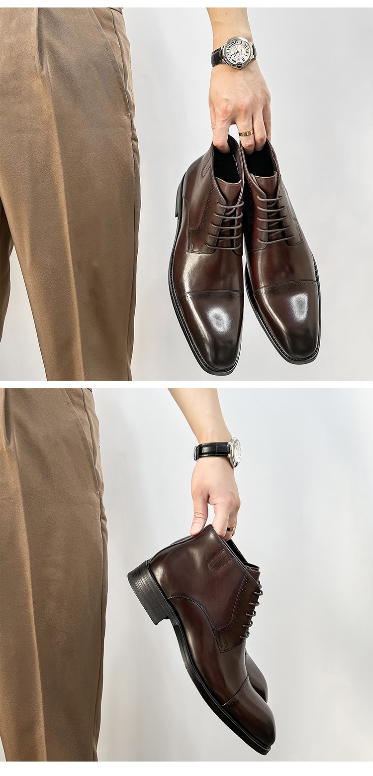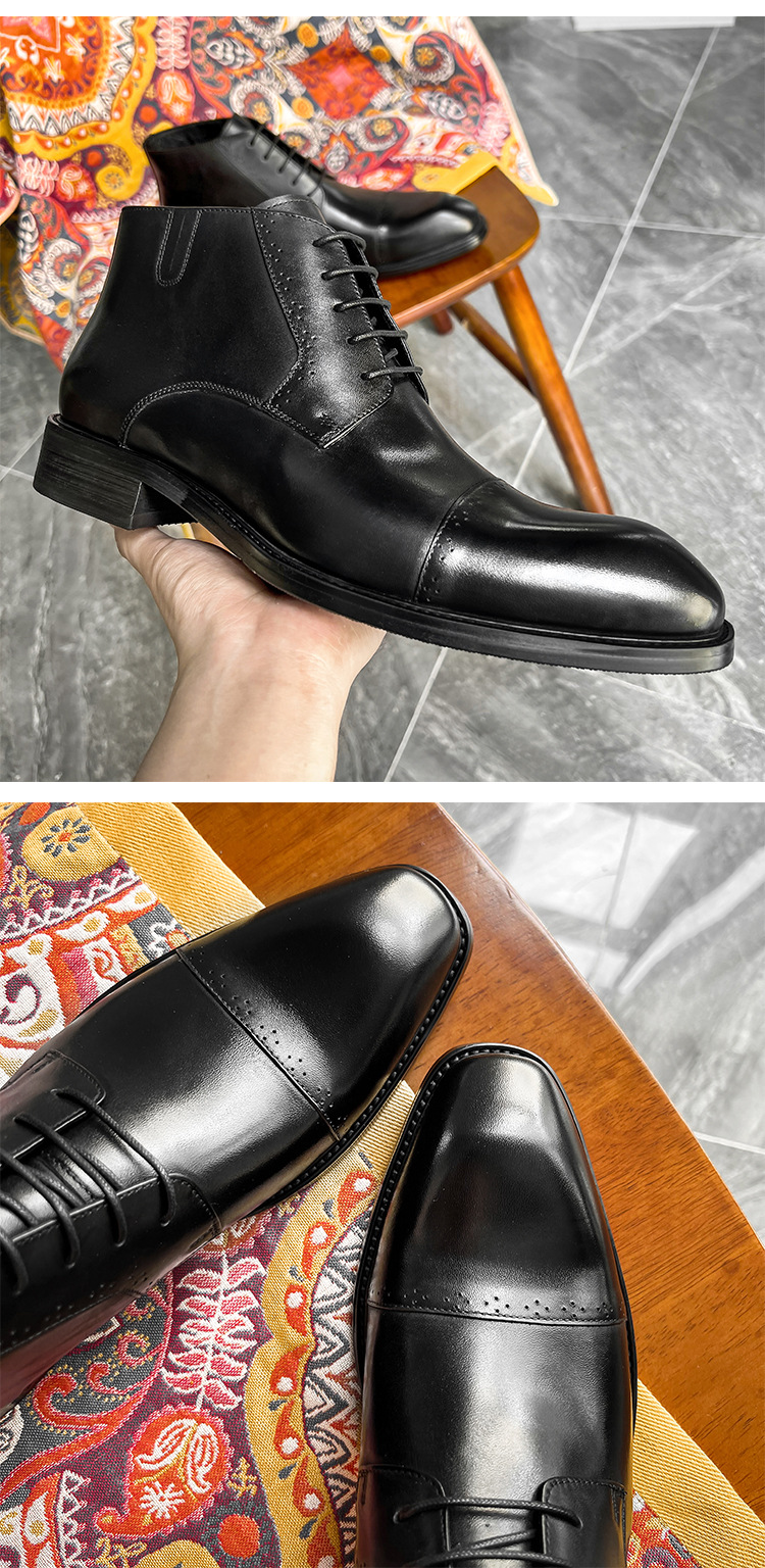 Giày bốt cổ cao kiểu mũi nhọn, được làm từ chất liệu da bò mềm mại và bền chắc. Kiểu dáng phối màu cổ điển mang đến vẻ ngoại hình cá tính và mạnh mẽ. Sản phẩm phù hợp để phối cùng nhiều loại trang phục như quần jeans hay quần kaki. Bạn có thể dễ dàng xỏ chân vào và cài khóa kéo bên hông. Đế giày được thiết kế vân chống trơn, giúp bảo vệ đôi chân bạn an toàn và thoải mái suốt ngày dài. | Tên sản phẩm: Giày Da Nam Chất Liệu Da Bò Mũi Nhọn - Giày Dép Nam | Mã sản phẩm: T6233 - Giá: 3.040.000đ | Mã nhà sản xuất: YADAO-G06Hình ảnh sản phẩm