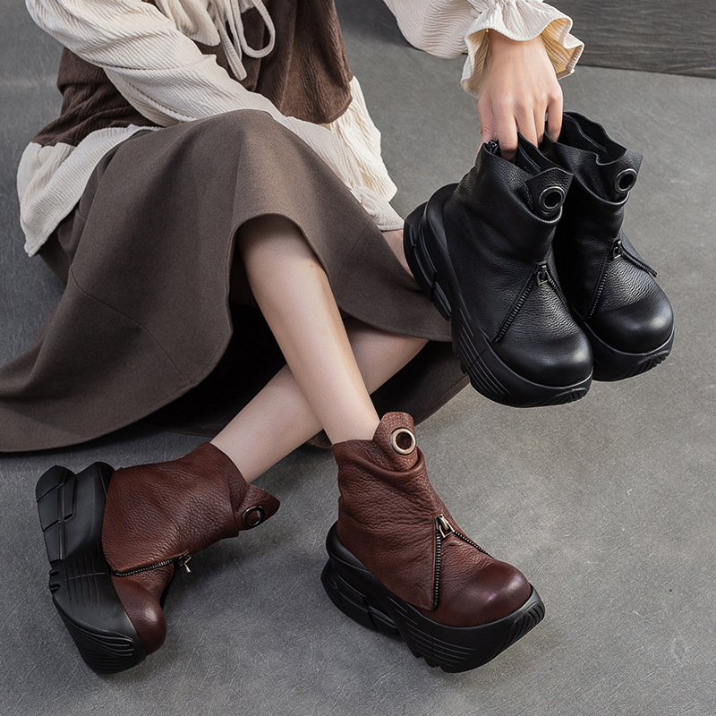 Boot Cổ Thấp Nữ Chất Liệu Da Bò Tăng Chiều Cao Đế Cao Hàng Mùa Xuân Thu Đông Phục Cổ Cổ Điển