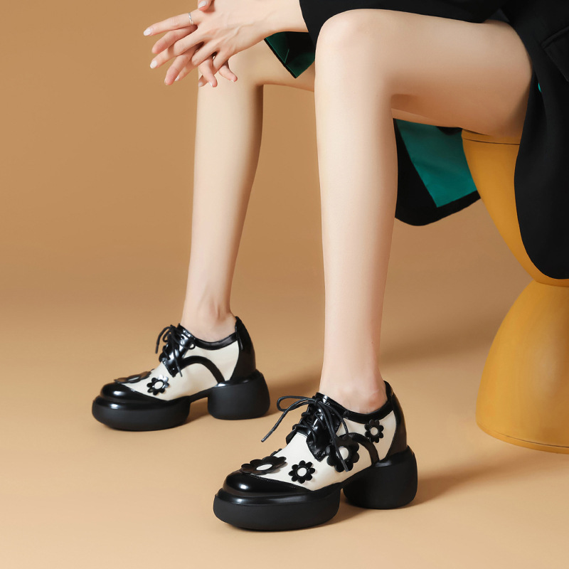 Giày Da Nữ Mũi Tròn Họa Tiết Hoa Đế Cao Hàng Mùa Xuân Thu Đông