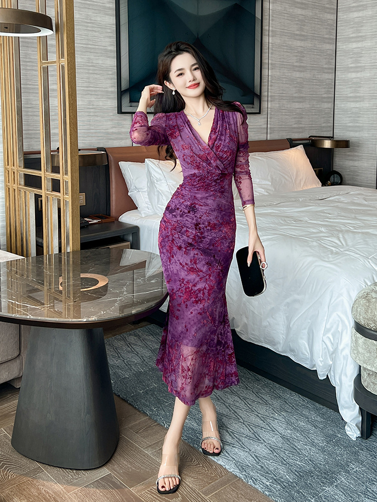 Váy Đầm Liền Thân Dáng Dài Nữ Lưới Mỏng Họa Tiết Hoa Cổ Chữ V Hàng Mùa Xuân Thu Đông