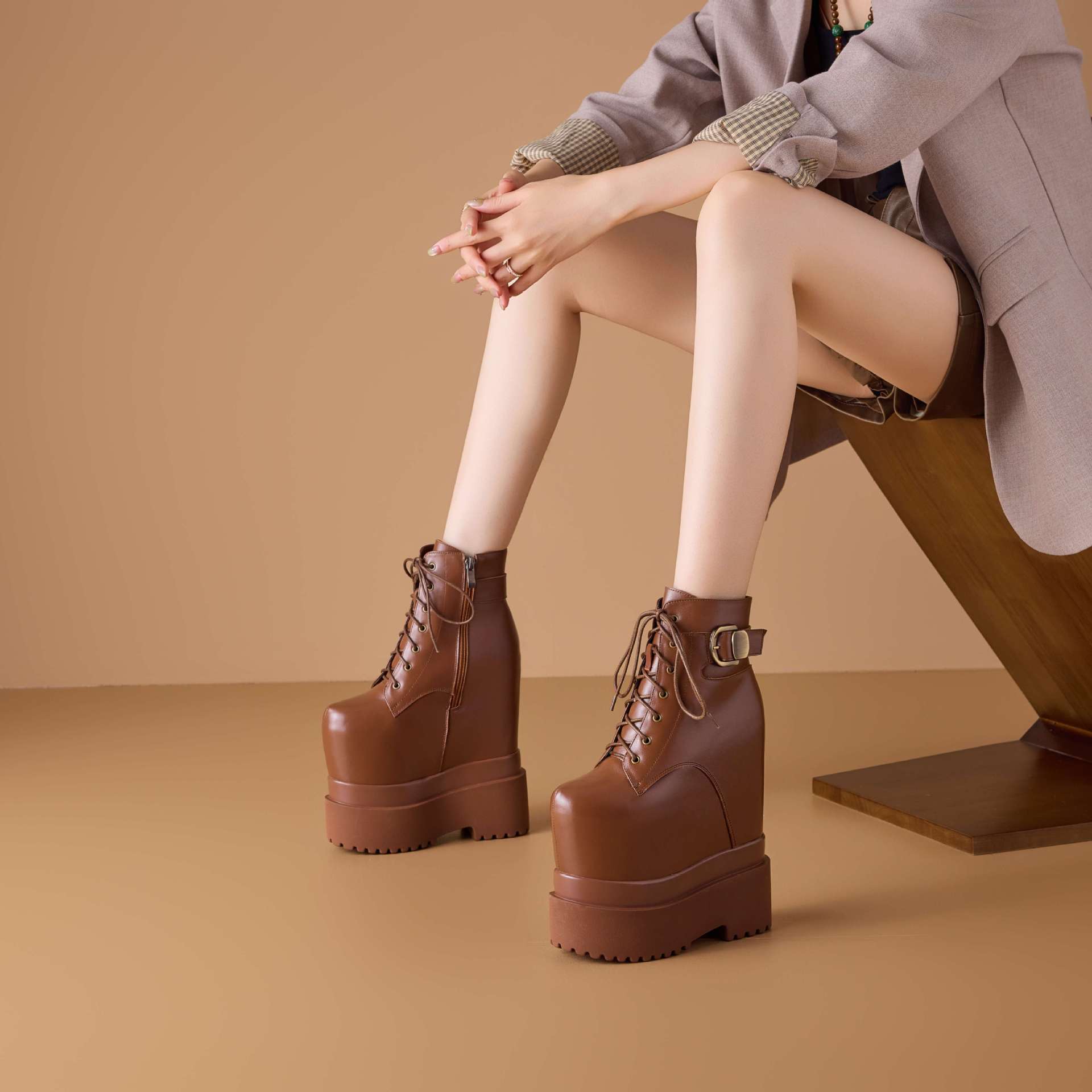 Boot Cổ Thấp Nữ Chất Liệu Da Bò Cao 20cm Tăng Chiều Cao Đế Xuồng Đế Cao