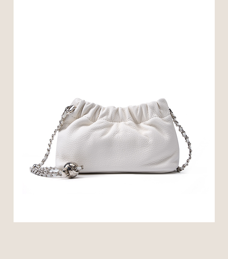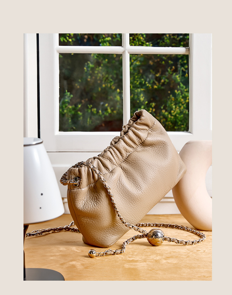 Chiếc túi này có kiểu dáng mềm mại như áng mây, với những đường nhăn xếp tinh tế. Dây đeo làm từ chuỗi hạt kim loại sáng bóng, có thể điều chỉnh để đeo trên v hoặc khoác chéo. Chất liệu da bò mềm mại mang lại cảm giác dễ chịu khi sử dụng. Thiết kế nhỏ gọn nhưng vẫn đủ rộng để đựng các vật dụng cần thiết hằng ngày như điện thoại, ví và chìa khóa. Rất phù hợp khi kết hợp với nhiều loại trang phục khác nhau. | Tên sản phẩm: Túi Xách Nữ Chất Liệu Da Bò - Túi Ví Nữ | Mã sản phẩm: A6741 - Giá: 720.000đ | Mã nhà sản xuất: GUDEA-G02Hình ảnh sản phẩm