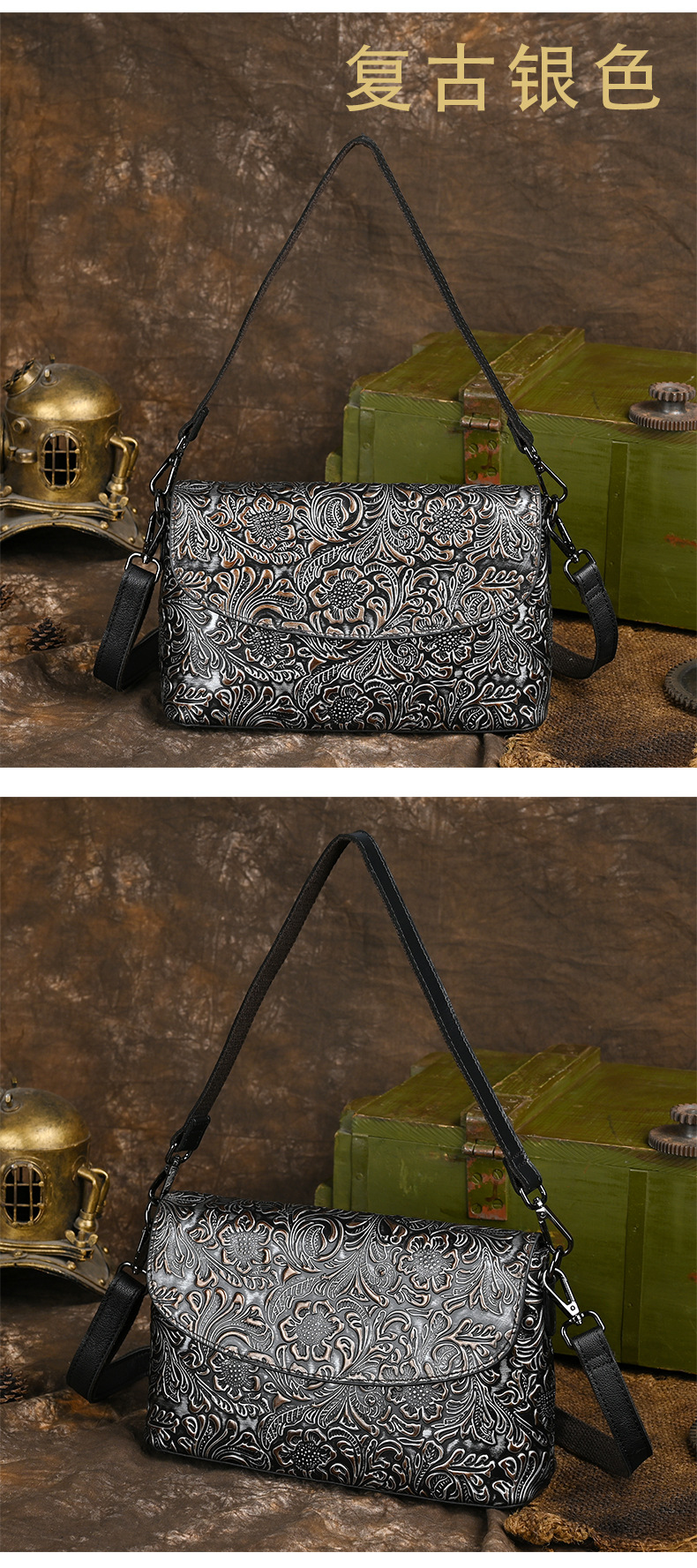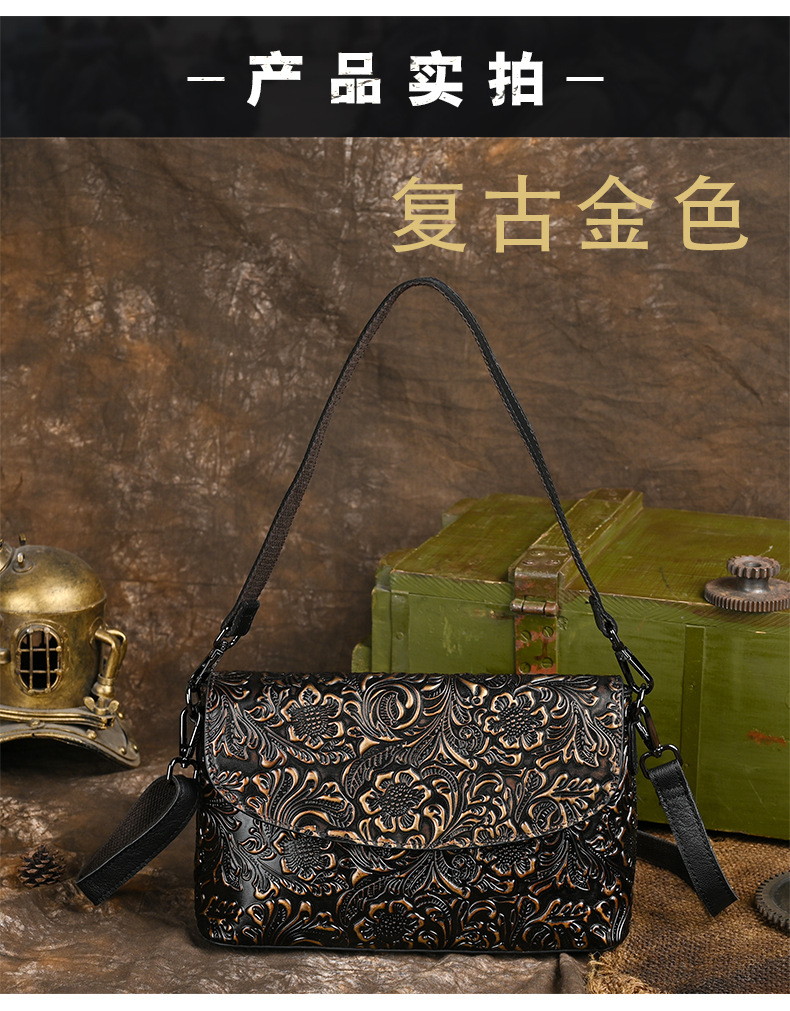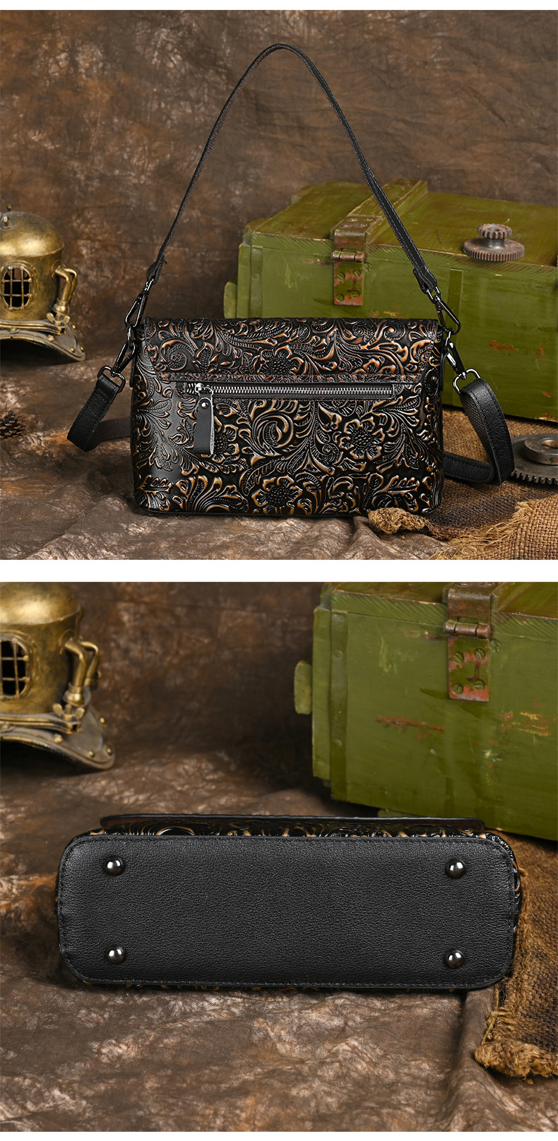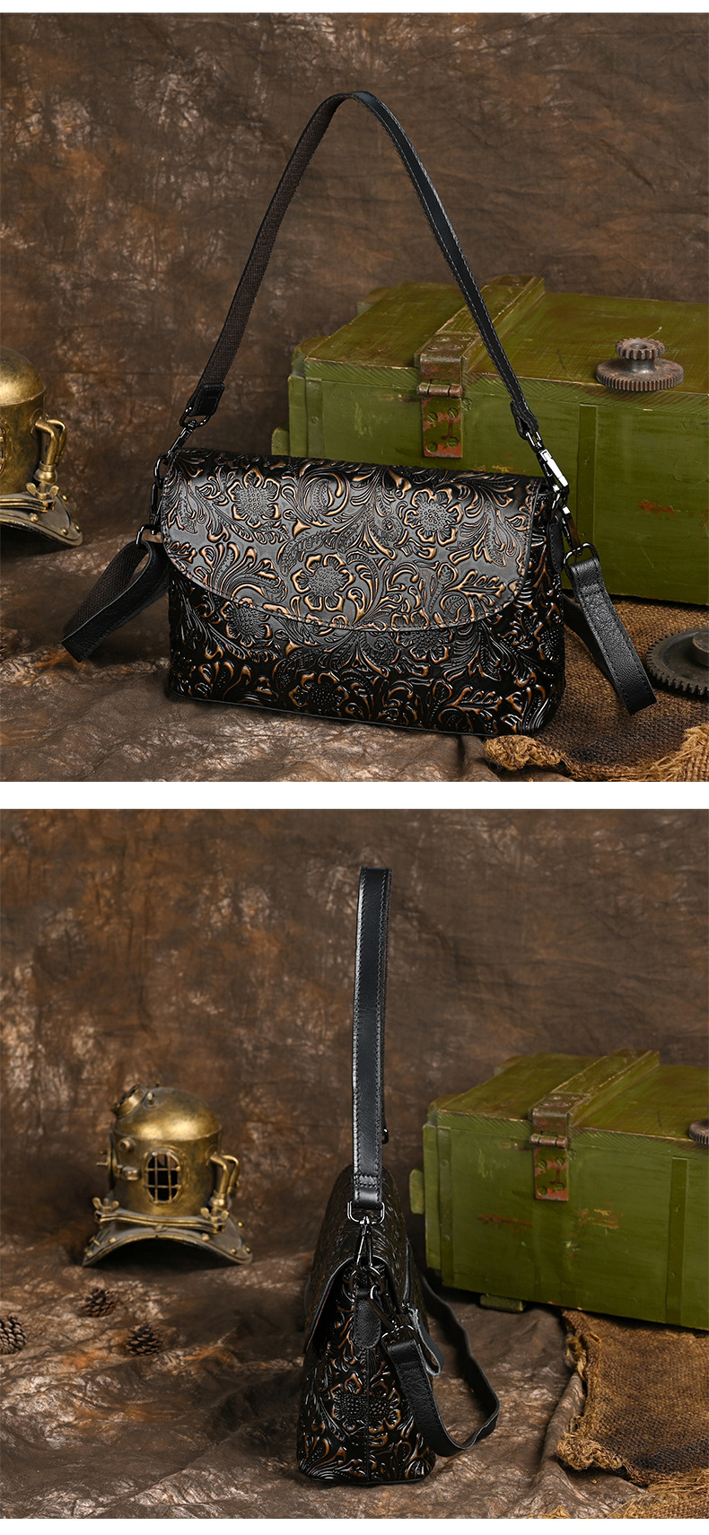 Túi xách được làm từ chất liệu da bò mềm mại, bề mặt có những đường vân nổi tinh tế. Kiểu dáng đeo chéo hoặc khoác dưới cánh tay rất tiện lợi, phù hợp cho nhiều dịp sử dụng. Màu sắc được tạo ra bằng phương pháp thủ công, mang vẻ đẹp cổ điển nhẹ nhàng. Sản phẩm có kết cấu chắc chắn, ngăn rộng rãi đựng được các vật dụng cần thiết. Cách dùng đơn giản, chỉ cần đeo túi và điều chỉnh dây đeo cho vừa vặn. | Tên sản phẩm: Túi Xách Nữ Chất Liệu Da Bò Họa Tiết Hoa Phục Cổ Cổ Điển - Túi Ví Nữ | Mã sản phẩm: A1001 - Giá: 940.000đ | Mã nhà sản xuất: GUDGE-G03Hình ảnh sản phẩm