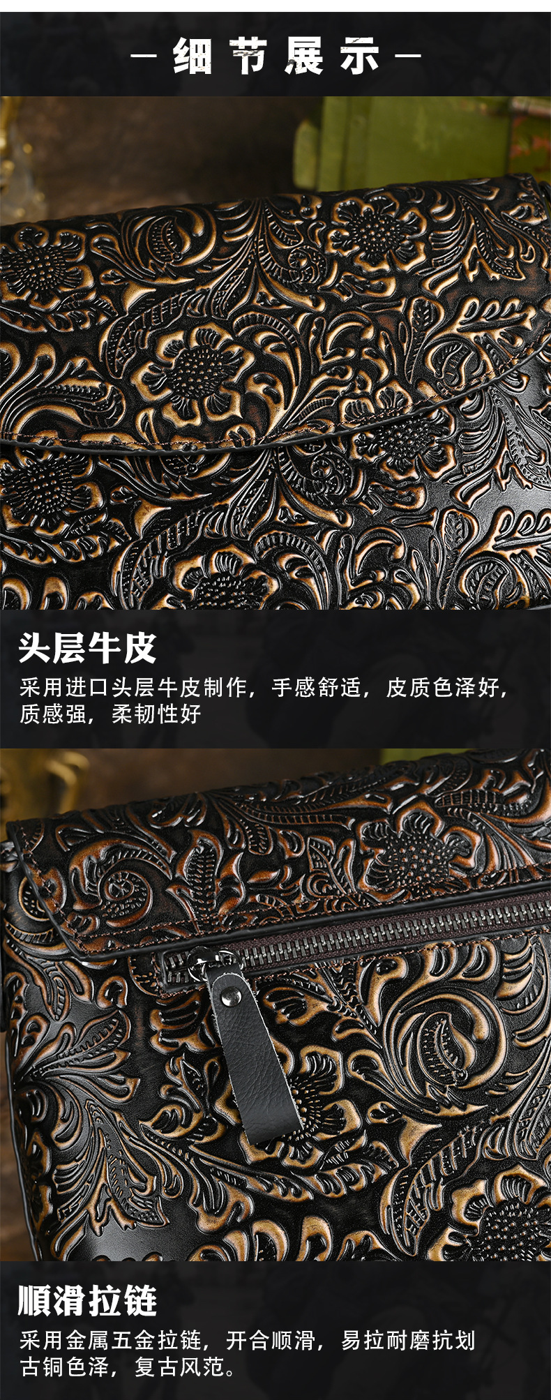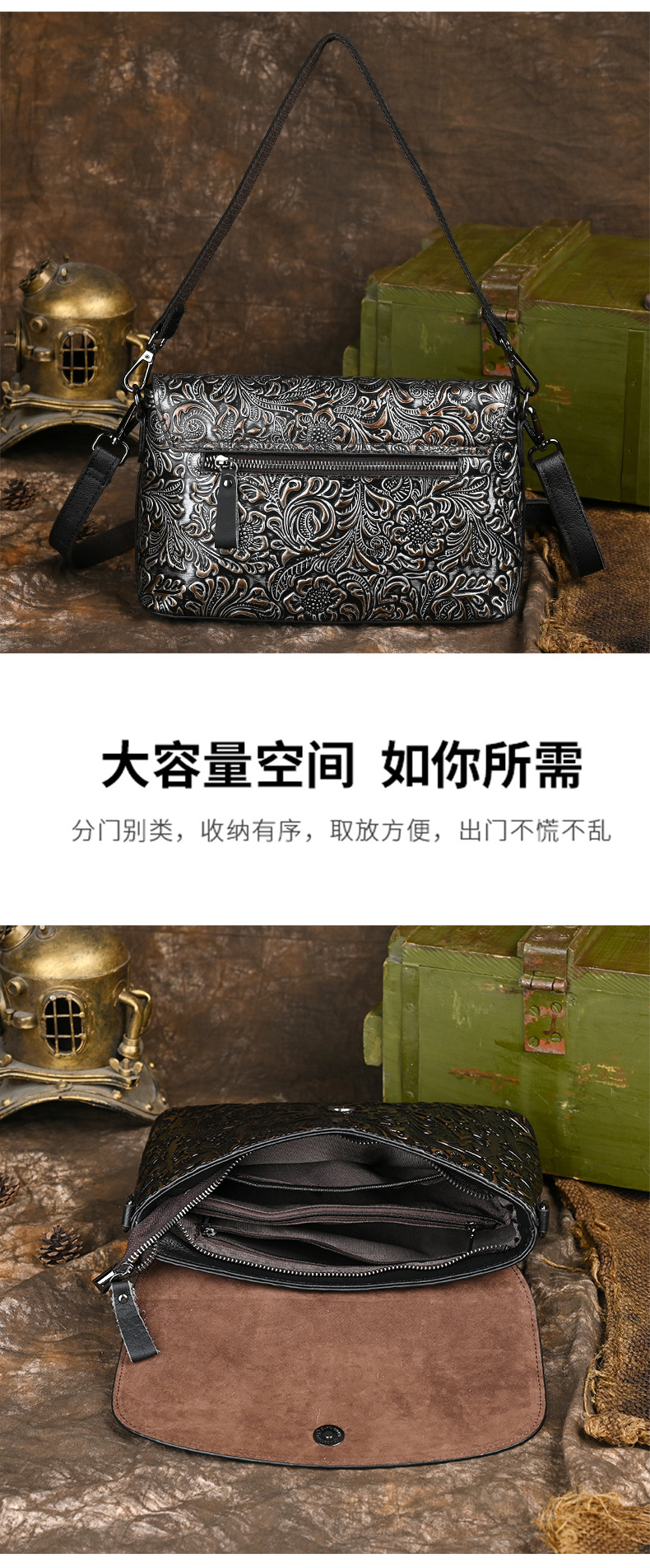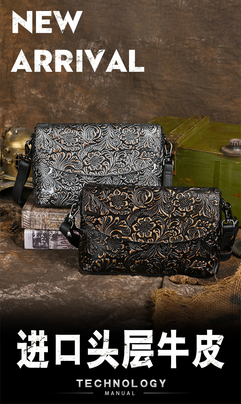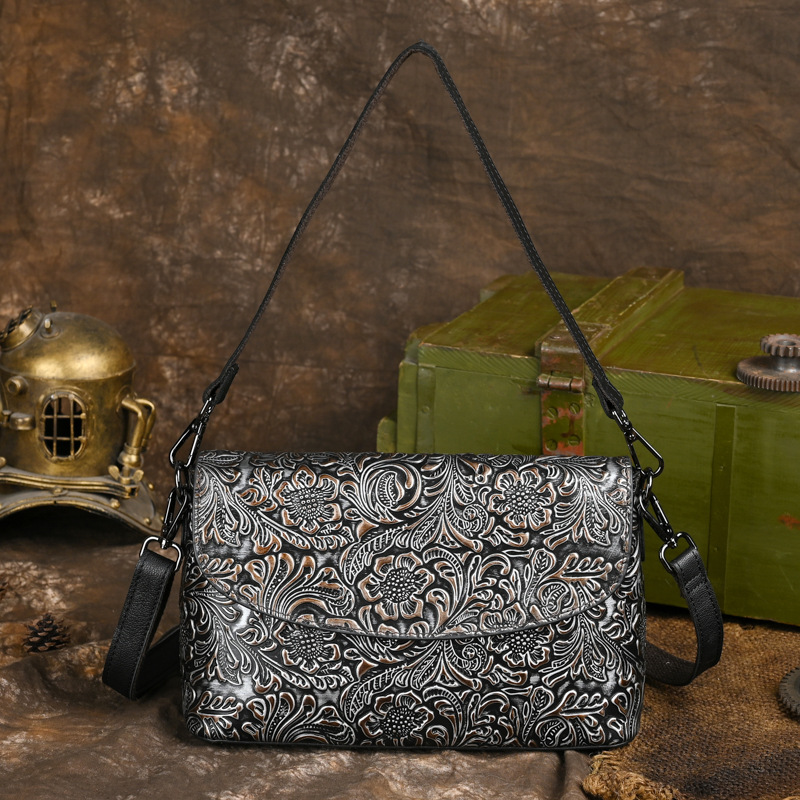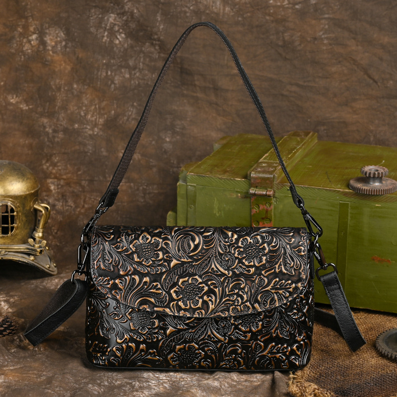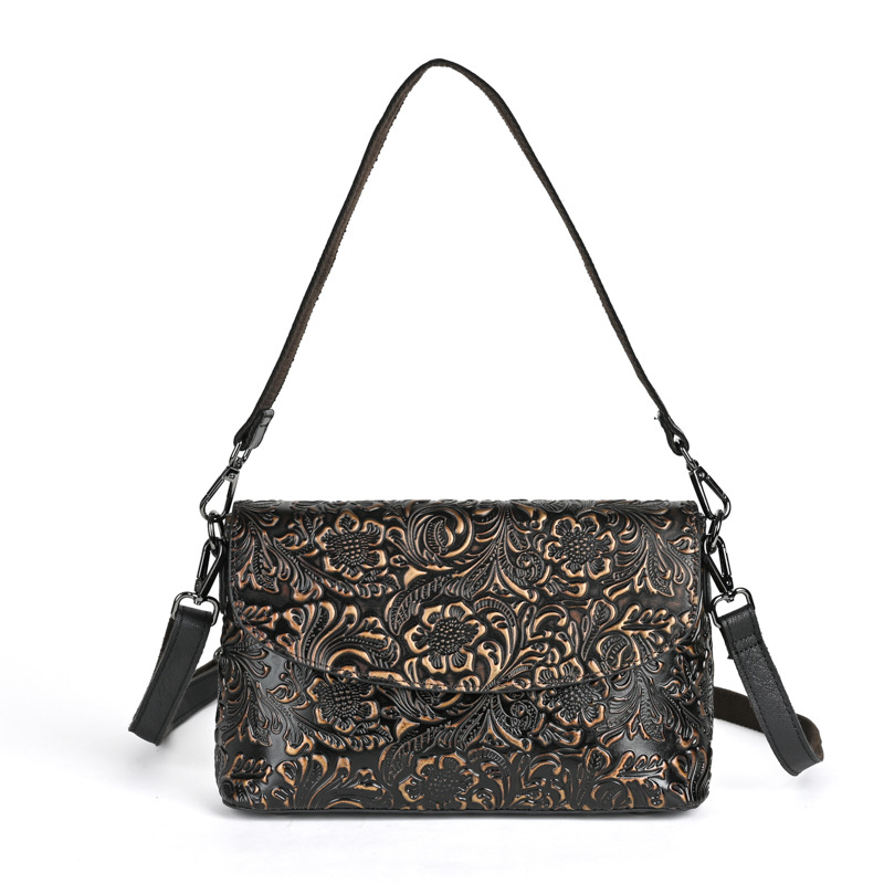 Túi xách được làm từ chất liệu da bò mềm mại, bề mặt có những đường vân nổi tinh tế. Kiểu dáng đeo chéo hoặc khoác dưới cánh tay rất tiện lợi, phù hợp cho nhiều dịp sử dụng. Màu sắc được tạo ra bằng phương pháp thủ công, mang vẻ đẹp cổ điển nhẹ nhàng. Sản phẩm có kết cấu chắc chắn, ngăn rộng rãi đựng được các vật dụng cần thiết. Cách dùng đơn giản, chỉ cần đeo túi và điều chỉnh dây đeo cho vừa vặn. | Tên sản phẩm: Túi Xách Nữ Chất Liệu Da Bò Họa Tiết Hoa Phục Cổ Cổ Điển - Túi Ví Nữ | Mã sản phẩm: A1001 - Giá: 940.000đ | Mã nhà sản xuất: GUDGE-G03Hình ảnh sản phẩm