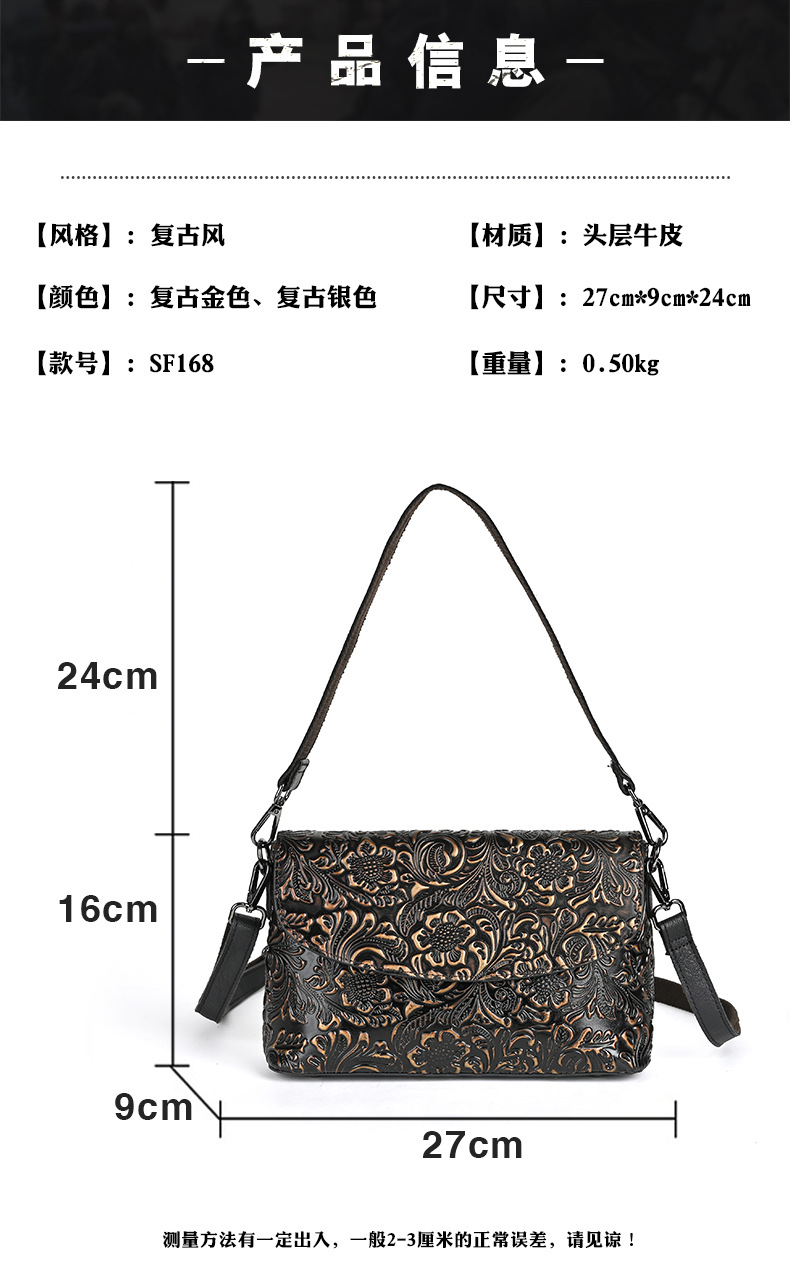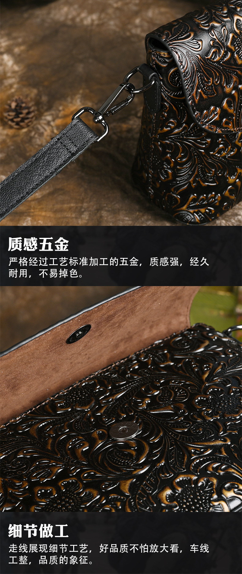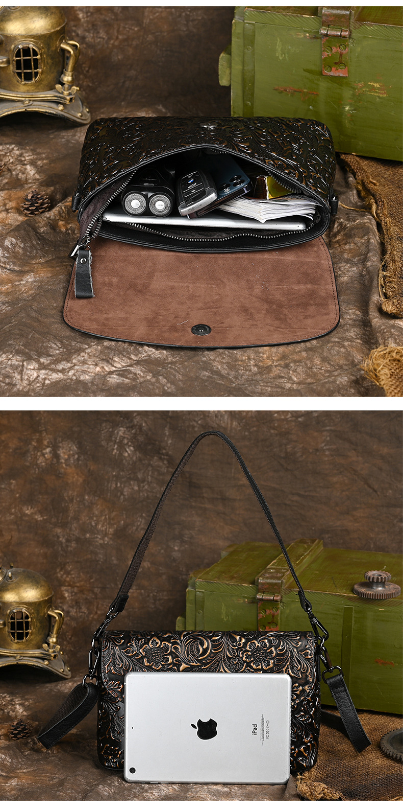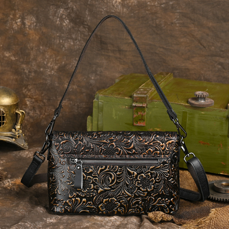 Túi xách được làm từ chất liệu da bò mềm mại, bề mặt có những đường vân nổi tinh tế. Kiểu dáng đeo chéo hoặc khoác dưới cánh tay rất tiện lợi, phù hợp cho nhiều dịp sử dụng. Màu sắc được tạo ra bằng phương pháp thủ công, mang vẻ đẹp cổ điển nhẹ nhàng. Sản phẩm có kết cấu chắc chắn, ngăn rộng rãi đựng được các vật dụng cần thiết. Cách dùng đơn giản, chỉ cần đeo túi và điều chỉnh dây đeo cho vừa vặn. | Tên sản phẩm: Túi Xách Nữ Chất Liệu Da Bò Họa Tiết Hoa Phục Cổ Cổ Điển - Túi Ví Nữ | Mã sản phẩm: A1001 - Giá: 940.000đ | Mã nhà sản xuất: GUDGE-G03Hình ảnh sản phẩm