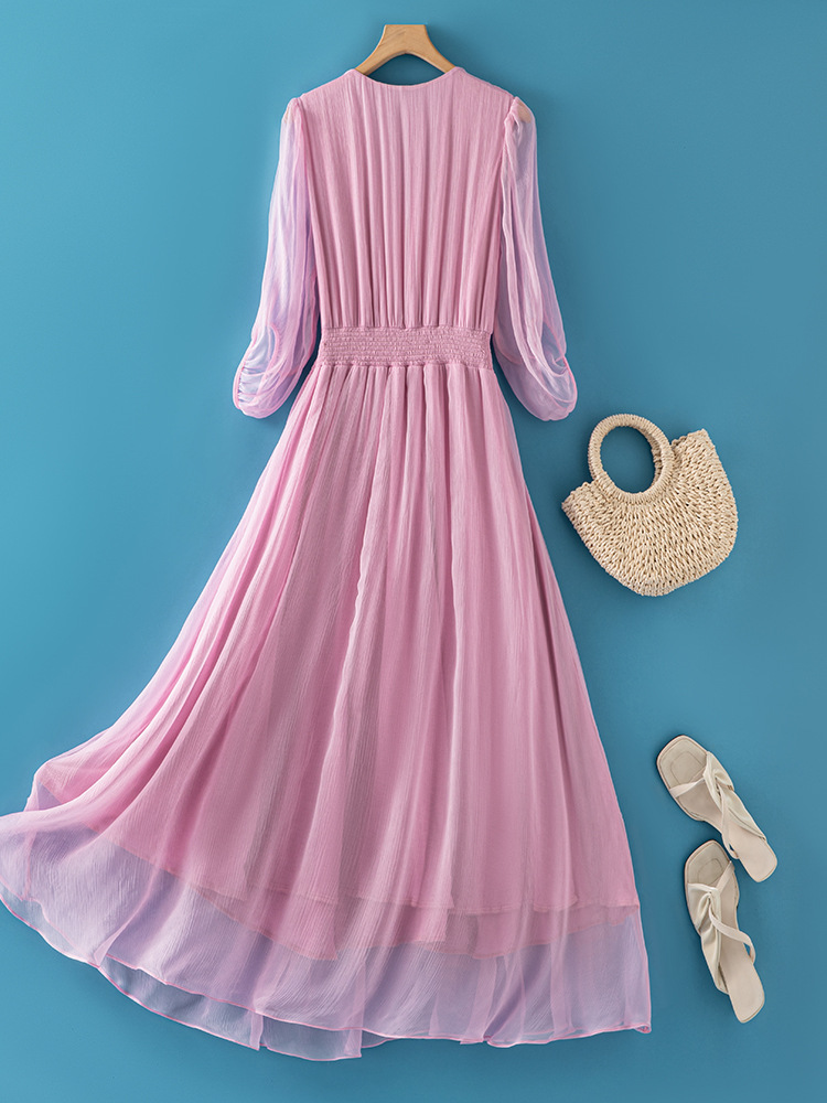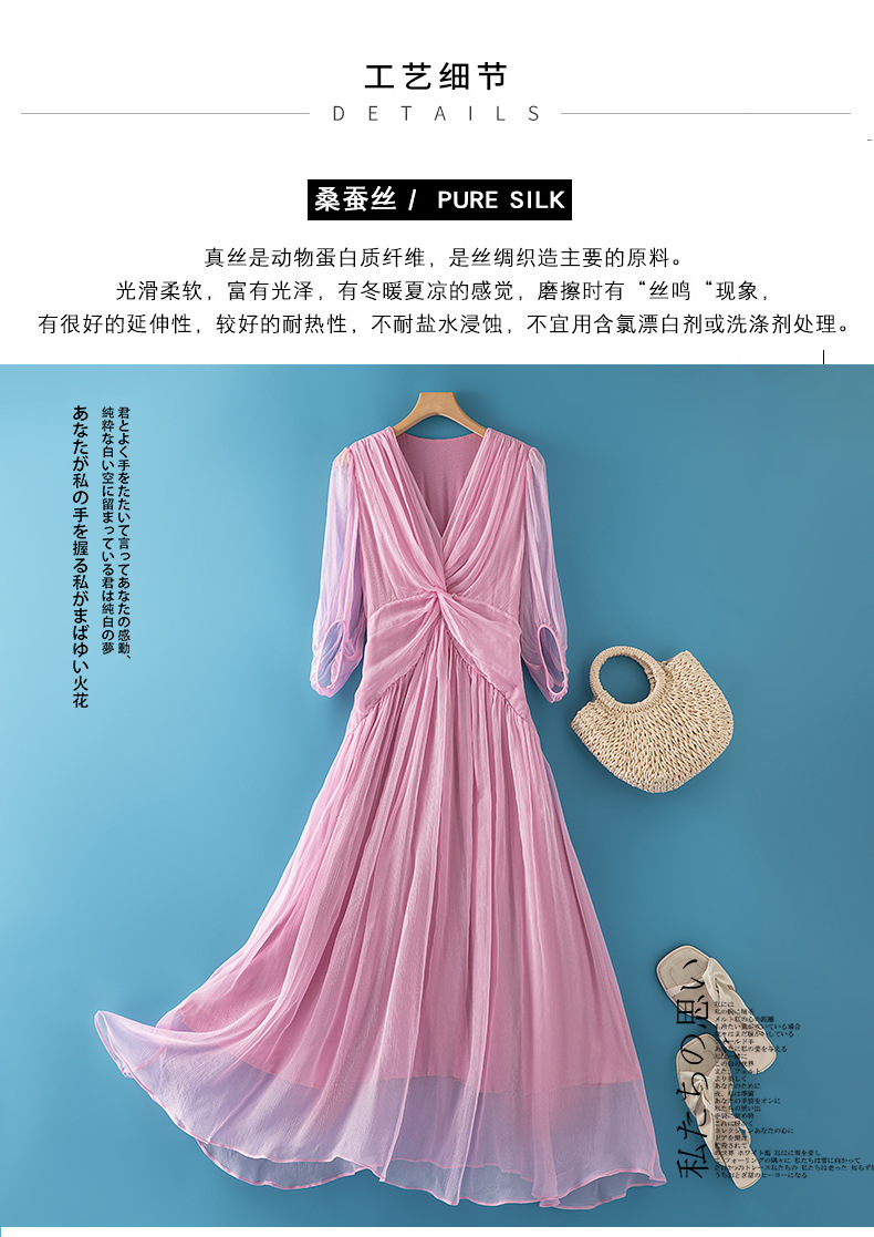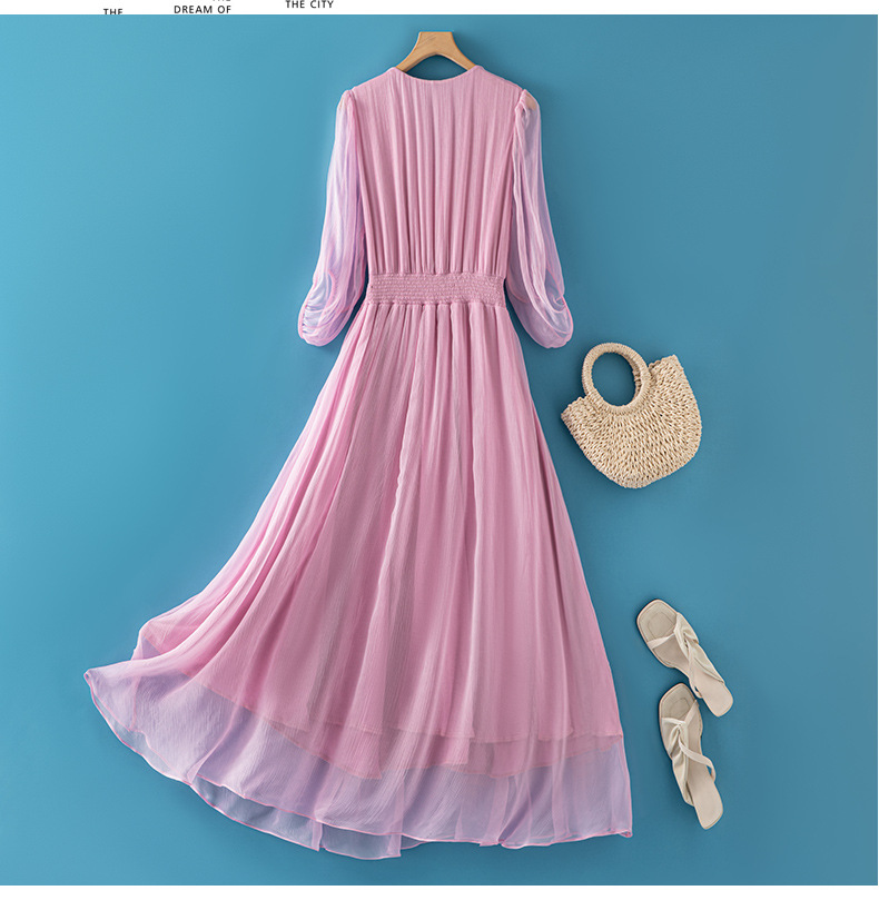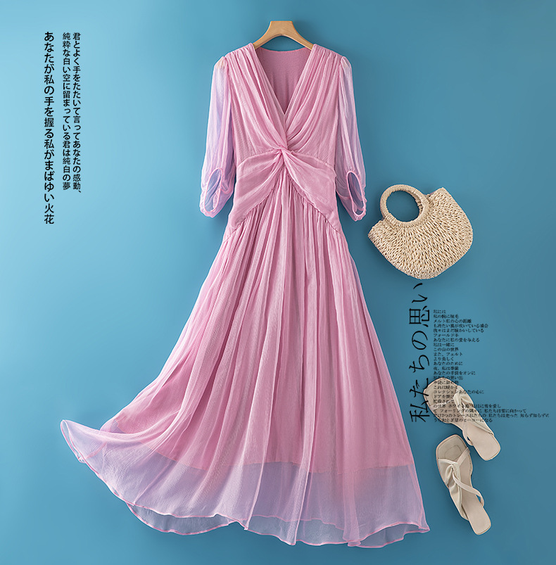 Đầm dài phong cách du lịch dành cho mùa hè, được làm từ chất liệu tơ tằm mềm mại và thoáng mát. Thiết kế bohemian với tông màu hồng nhẹ nhàng, tôn lên vẻ dịu dàng và nét duyên dáng cho người mặc. Kiểu dáng ôm vừa phải giúp tạo cảm giác thon gọn. Sản phẩm phù hợp cho các dịp dạo phố, đi chơi hay dự tiệc nhẹ. Giặt tay hoặc giặt máy với chế độ nhẹ và phơi trong bóng râm để giữ chất vải bền đẹp. | Tên sản phẩm: Váy Đầm Liền Thân Dáng Dài Nữ Chất Liệu Lụa Tơ Tằm Hàng Mùa Hè - Thời Trang Nữ | Mã sản phẩm: L2548 - Giá: 2.360.000đ | Mã nhà sản xuất: SHDA-G05Hình ảnh sản phẩm