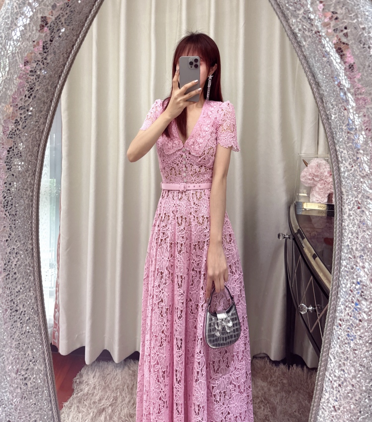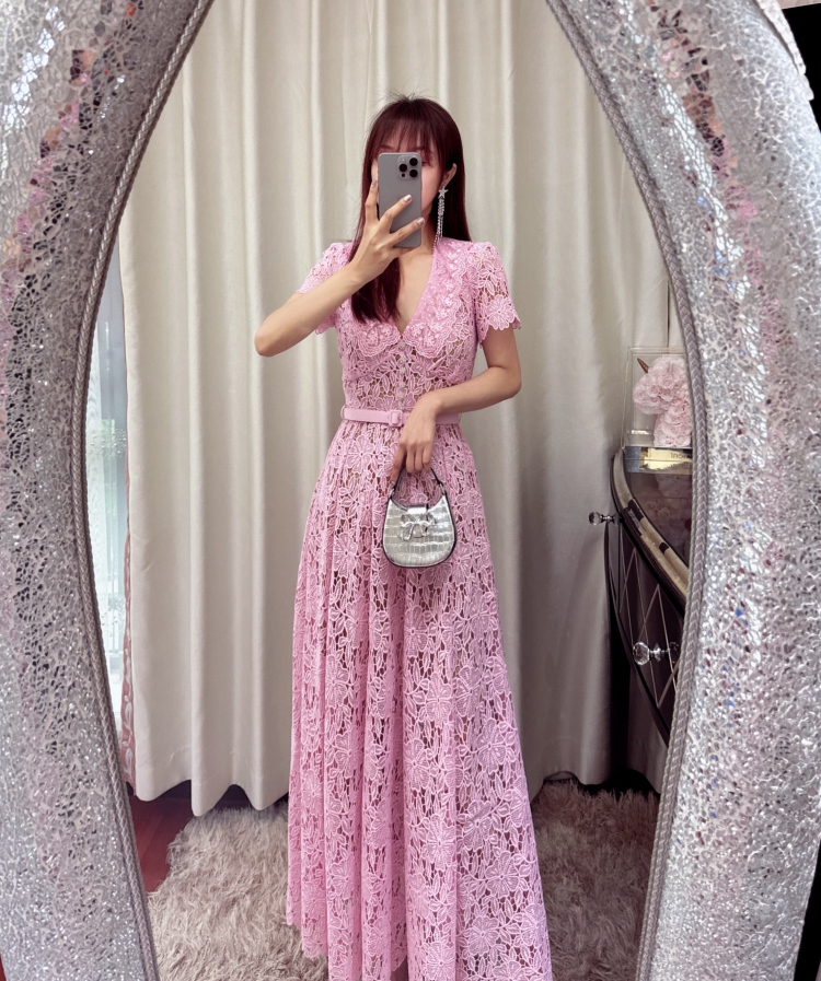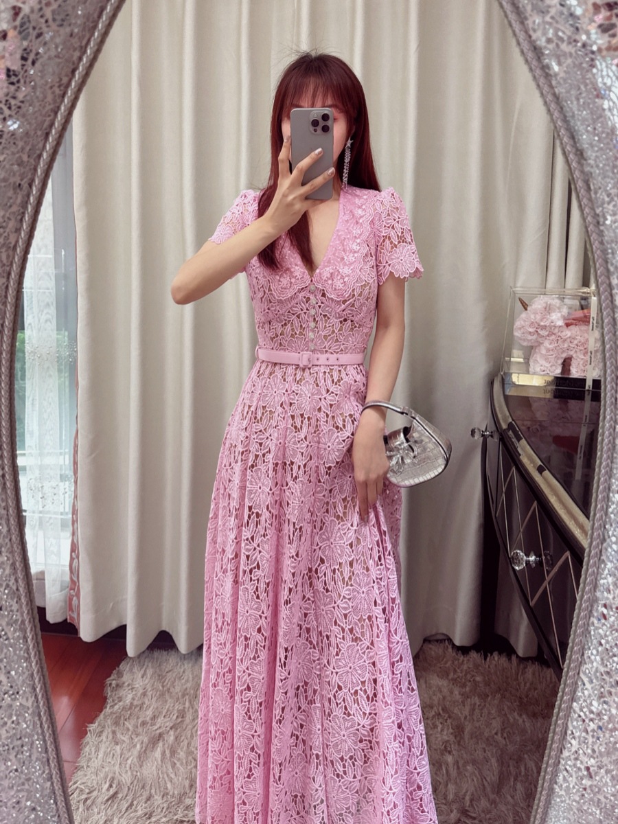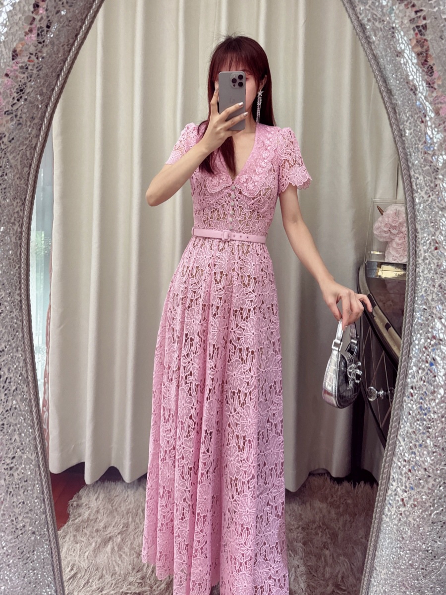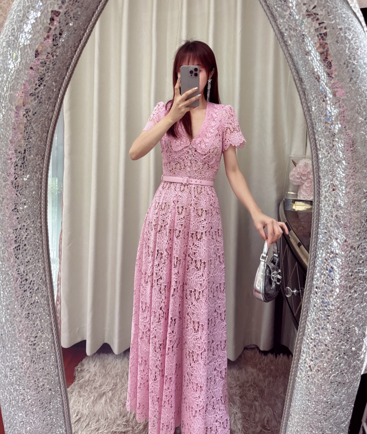 Chiếc váy ngắn tay này có màu hồng dịu dàng, được làm từ chất vải dày dặn và thoáng mát. Điểm nhấn là phần cổ bẻ cùng những đường thêu tinh xảo và chi tiết ren trong suốt. Thân váy kết hợp nhiều mảnh vải tạo nên những đường nét ấn tượng. Phần chân váo xòe rộng, tạo dáng điệu đà. Sản phẩm đi kèm một chiếc thắt lưng để bạn có thể điều chỉnh form dáng. Mặc kèm với giày bệt hoặc giày có qu để hoàn thiện bộ trang phục. | Tên sản phẩm: Váy Đầm Liền Thân Dáng Dài Nữ Chất Liệu Ren Ngắn Tay Thêu Họa Tiết Hoa Kín Cổ - Thời Trang Nữ | Mã sản phẩm: A0701 - Giá: 2.680.000đ | Mã nhà sản xuất: HADN-G06Hình ảnh sản phẩm