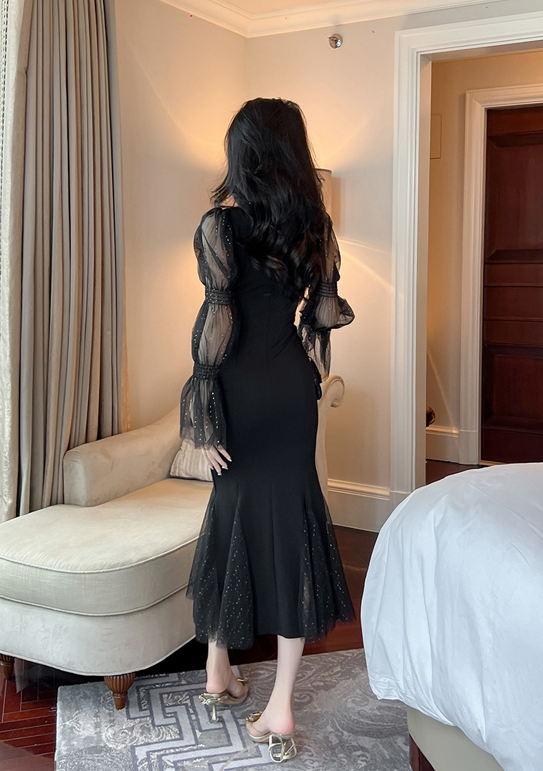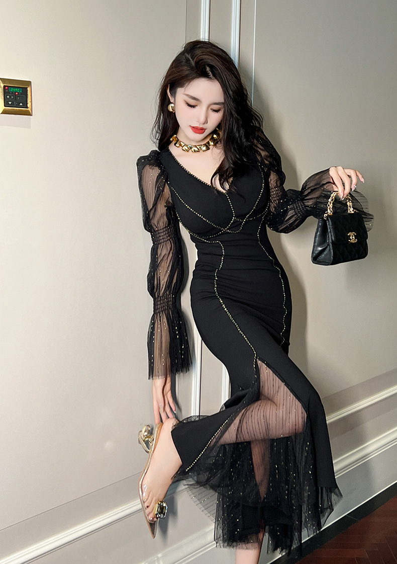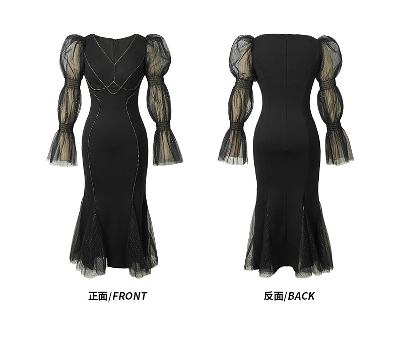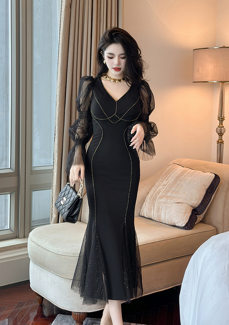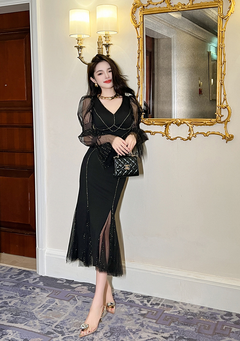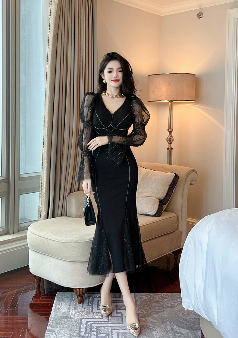 Chiếc đầm dáng dài ôm sát cơ thể, điểm nhấn là phần đuôi cá thướt tha. Cổ khoét kiểu chữ V tinh tế kết hợp tay bồng nhẹ nhàng tạo nên vẻ đẹp lãng mạn. Phần viền vải mỏng mềm mại nối dọc thân tăng thêm nét duyên dáng. Kiểu dáng giúp tôn lên đường nét cơ thể, phù hợp cho những buổi tiệc hoặc sự kiện. Mặc cùng giày cao gót để hoàn thiện set đồ. | Tên sản phẩm: Váy Đầm Liền Thân Dáng Dài Nữ Dáng Ôm Lưới Mỏng Kiểu Đuôi Cá Cổ Chữ V Hàng Mùa Xuân Thu Đông - Thời Trang Nữ | Mã sản phẩm: B4668 - Giá: 1.260.000đ | Mã nhà sản xuất: CHDG-G04Hình ảnh sản phẩm
