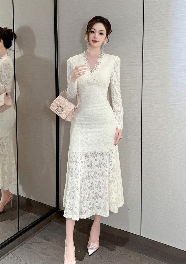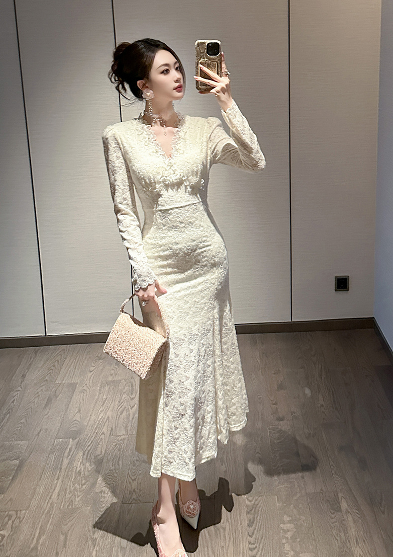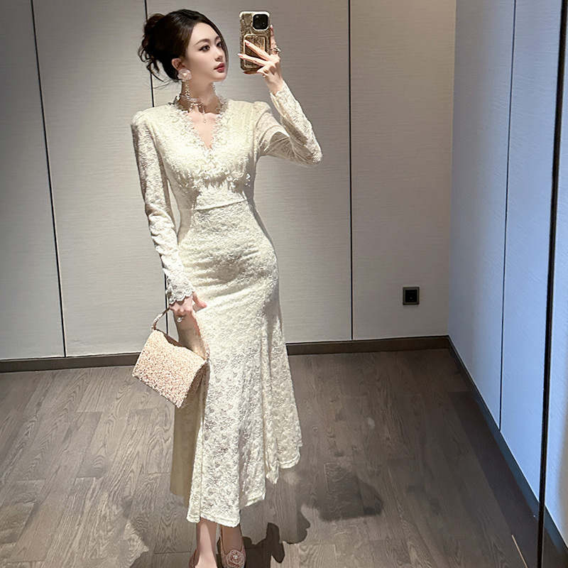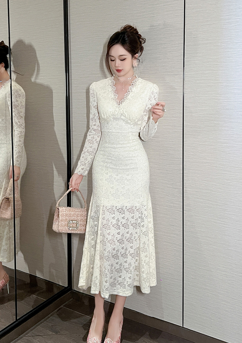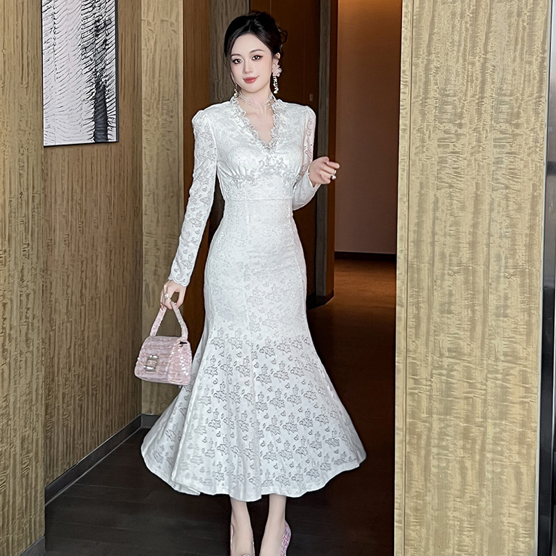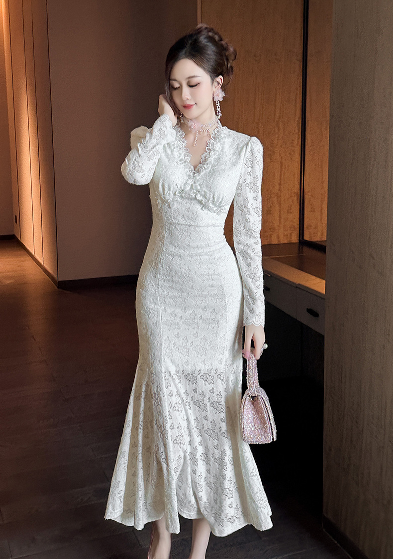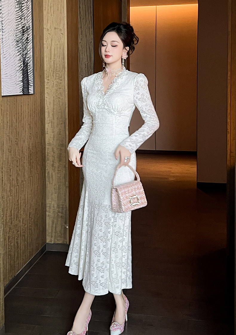 Chiếc đầm dáng dài cho nàng thêm phần duyên dáng và thanh thoát. Cổ chữ V nhẹ nhàng kết hợp cùng điểm nhấn ren tinh tế dọc thân. Thiết kế ôm vừa vặn ở thân trên và xòe nhẹ ở phần đuôi cá, giúp tôn lên những đường nét cơ thể. Chất vải mềm mại mang đến sự dễ chịu. Mẫu đầm này phù hợp để mặc trong nhiều dịp khác nhau. | Tên sản phẩm: Váy Đầm Liền Thân Nữ Chất Liệu Ren Dáng Ôm Kiểu Đuôi Cá Cổ Chữ V Hàng Mùa Xuân Thu Đông - Thời Trang Nữ | Mã sản phẩm: B0542 - Giá: 1.490.000đ | Mã nhà sản xuất: CHDG-G04Hình ảnh sản phẩm