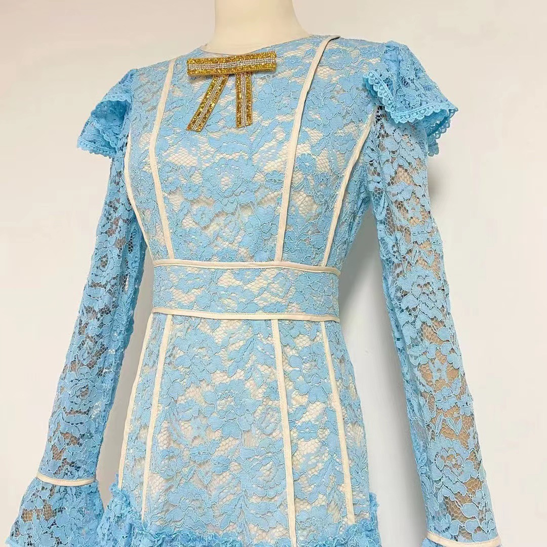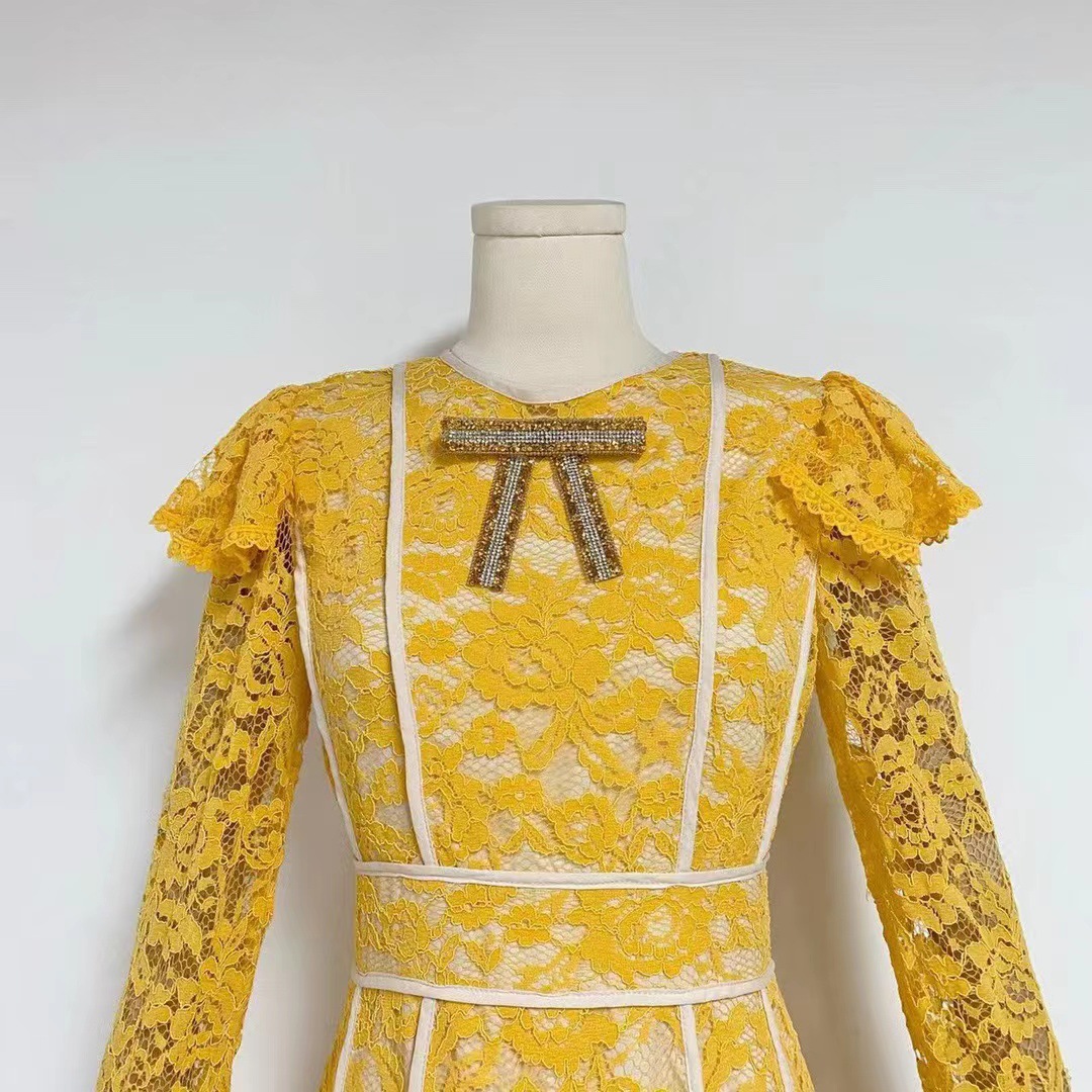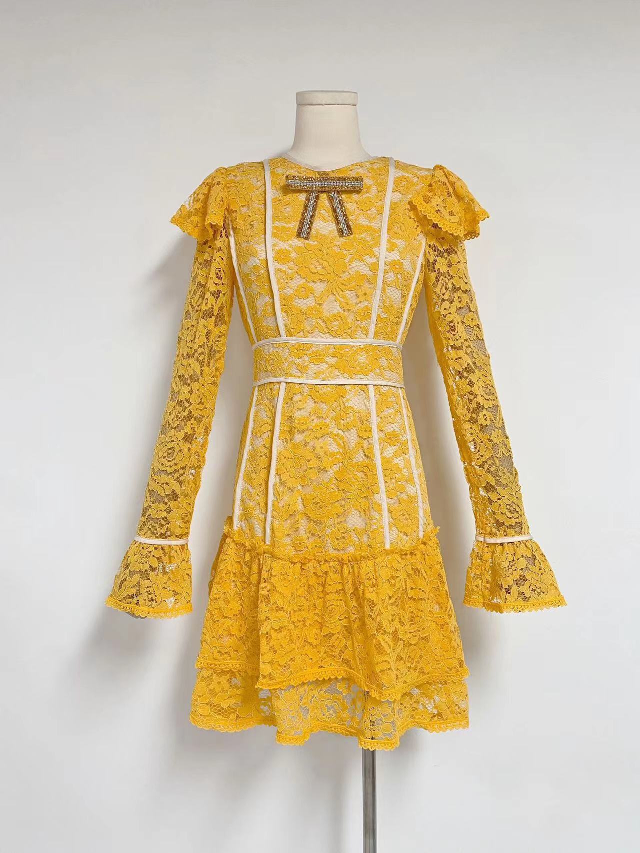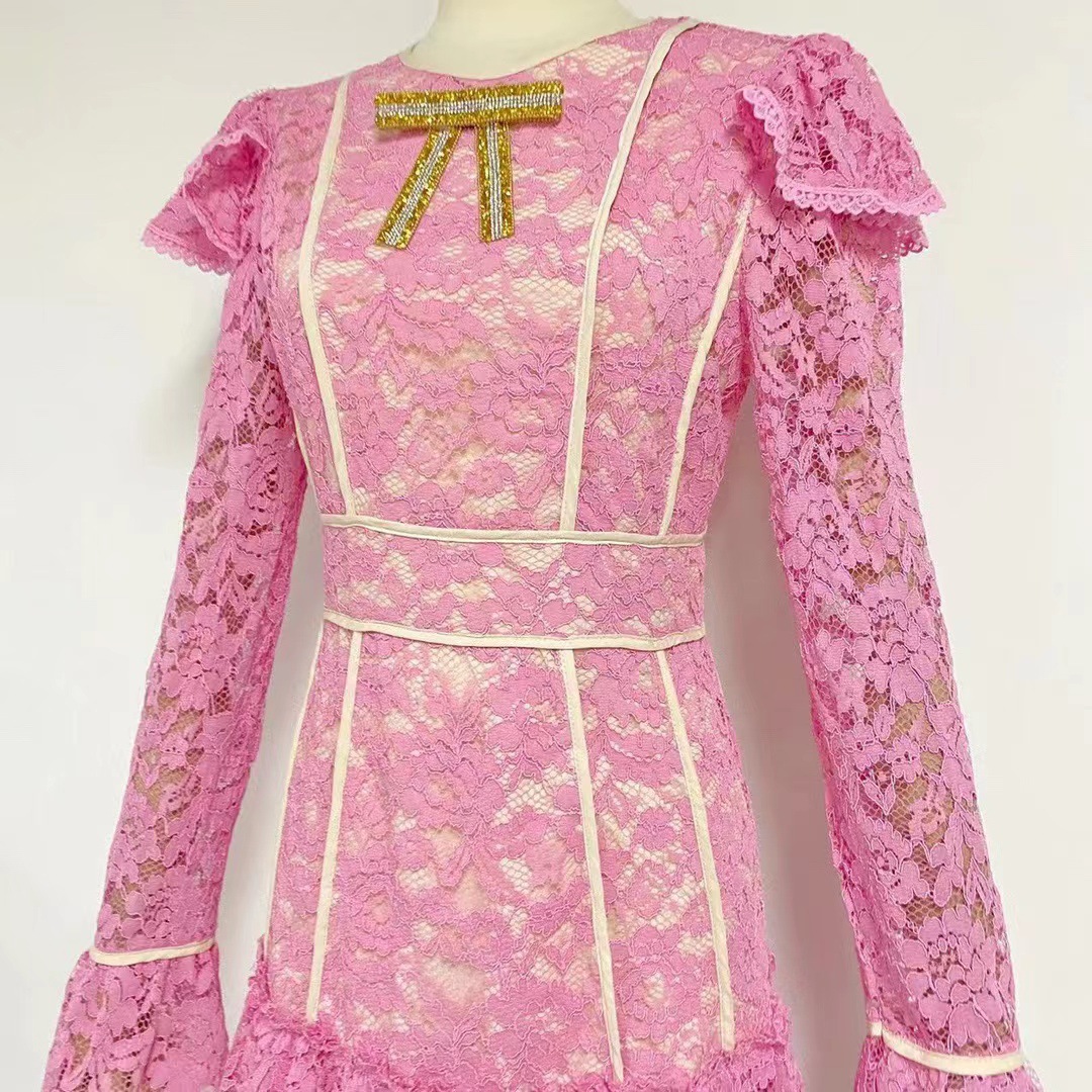 Chiếc đầm ngắn tay loe này là lựa chọn tuyệt vời cho mùa thu. Cổ tròn và eo chiết giúp tôn dáng. Điểm nhấn đặc biệt đến từ các đường viền kết hợp chất liệu ren tinh tế ở tay áo và phần chân váy, tạo nên vẻ đẹp nữ tính và duyên dáng. Mẫu đầm dễ dàng phối hợp với giày cao gót hay giày bệt. Bạn có thể mặc đi làm, đi chơi hoặc dự tiệc nhẹ. | Tên sản phẩm: Váy Đầm Liền Thân Nữ Chất Liệu Ren Hàng Mùa Xuân Thu Đông - Thời Trang Nữ | Mã sản phẩm: K7591 - Giá: 2.290.000đ | Mã nhà sản xuất: GUDG-G05Hình ảnh sản phẩm