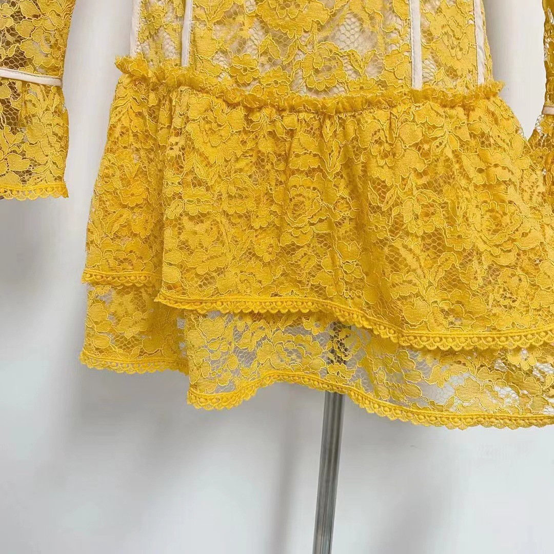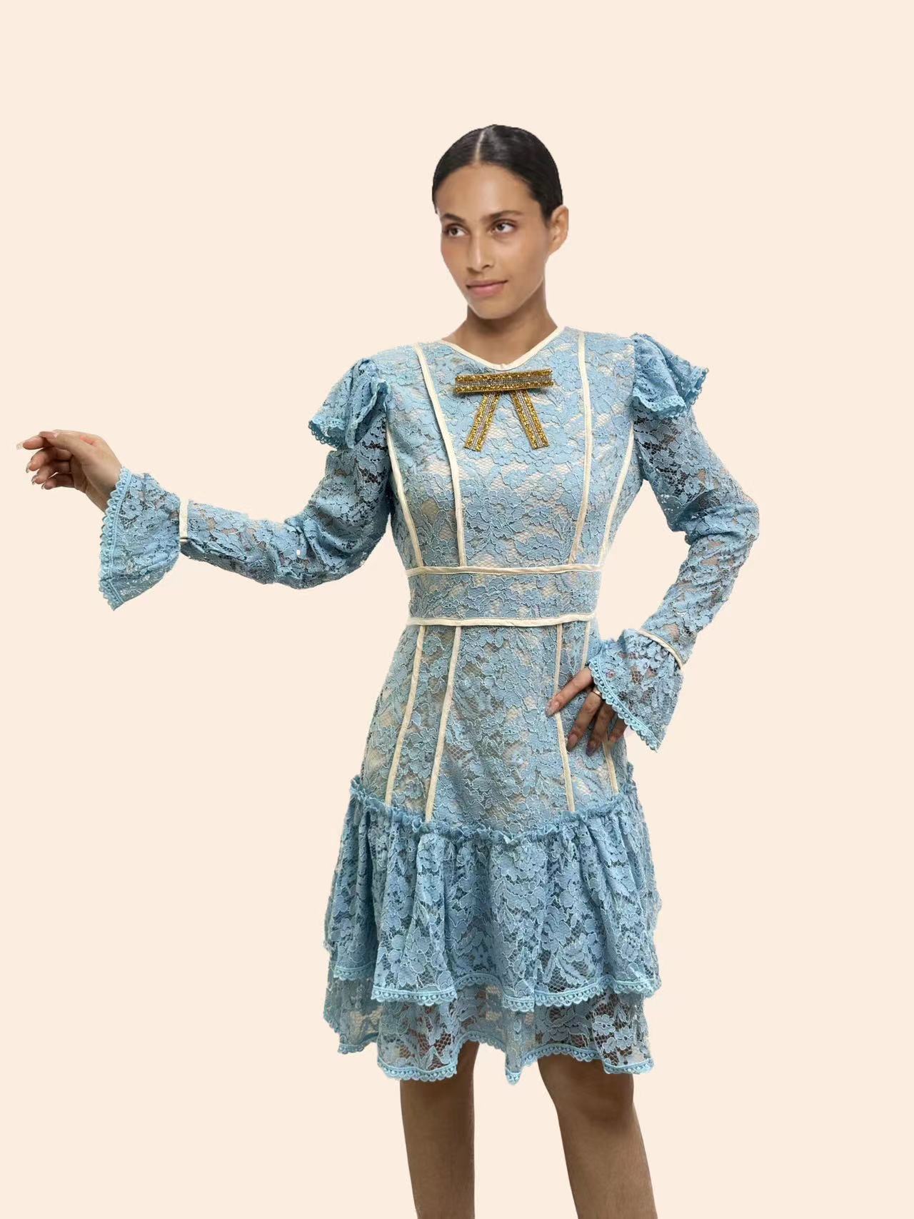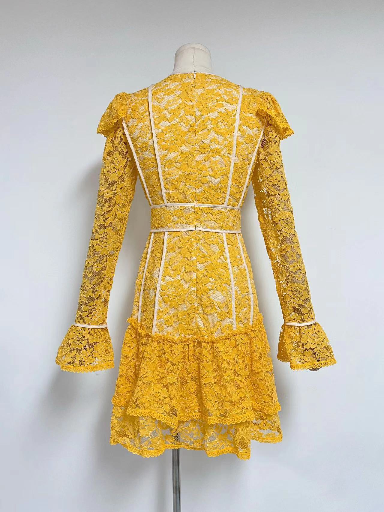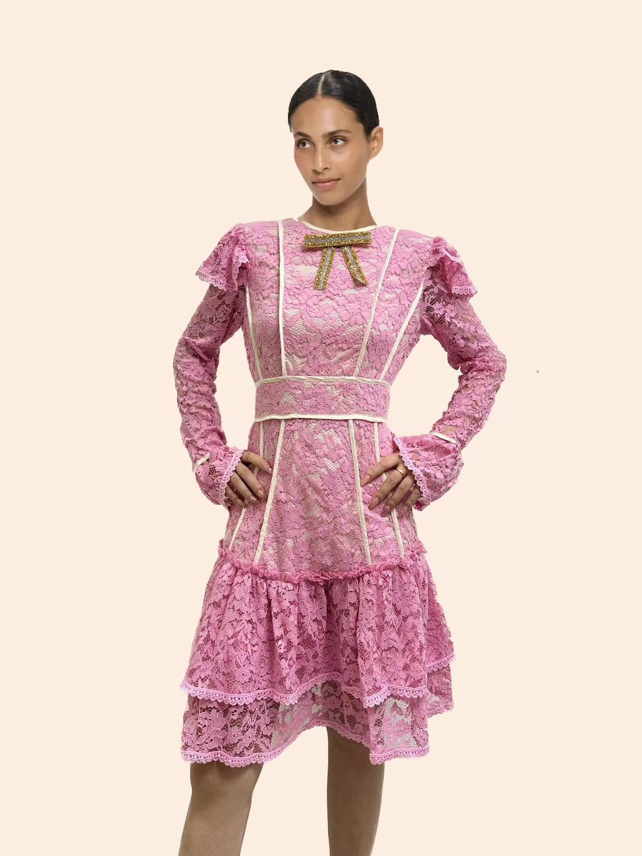 Chiếc đầm ngắn tay loe này là lựa chọn tuyệt vời cho mùa thu. Cổ tròn và eo chiết giúp tôn dáng. Điểm nhấn đặc biệt đến từ các đường viền kết hợp chất liệu ren tinh tế ở tay áo và phần chân váy, tạo nên vẻ đẹp nữ tính và duyên dáng. Mẫu đầm dễ dàng phối hợp với giày cao gót hay giày bệt. Bạn có thể mặc đi làm, đi chơi hoặc dự tiệc nhẹ. | Tên sản phẩm: Váy Đầm Liền Thân Nữ Chất Liệu Ren Hàng Mùa Xuân Thu Đông - Thời Trang Nữ | Mã sản phẩm: K7591 - Giá: 2.290.000đ | Mã nhà sản xuất: GUDG-G05Hình ảnh sản phẩm