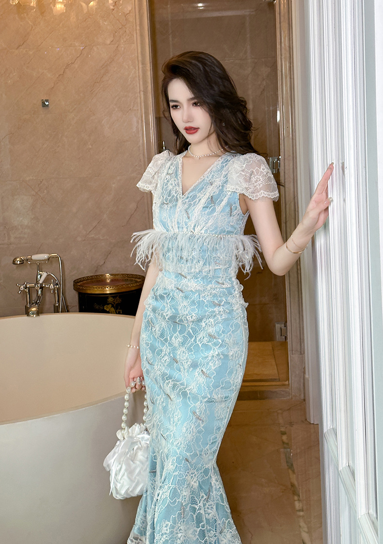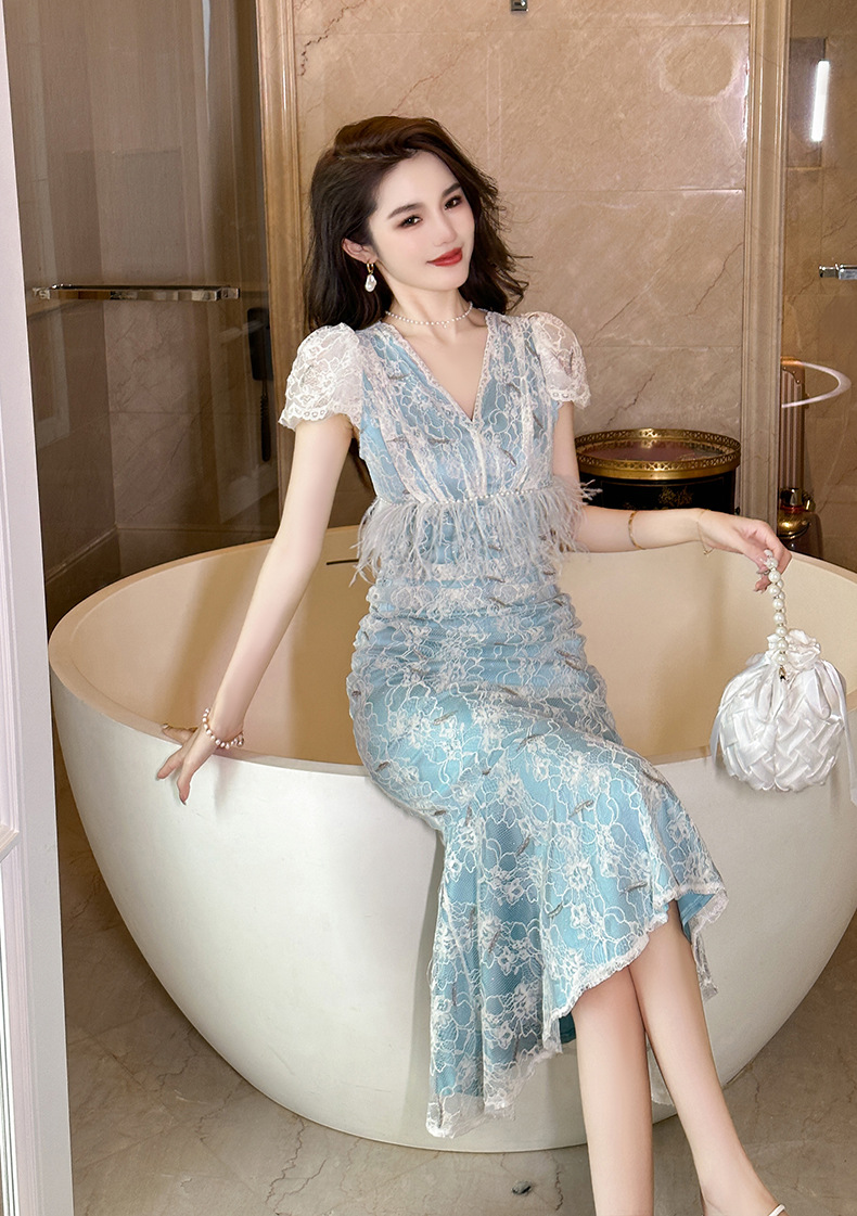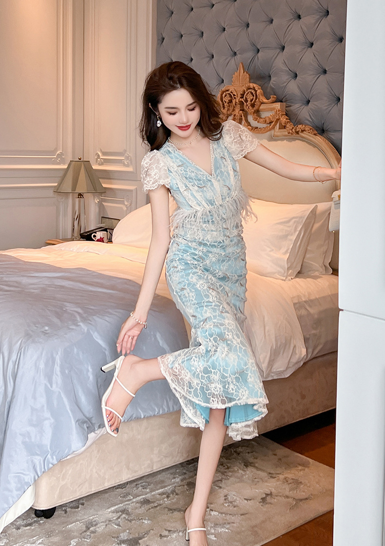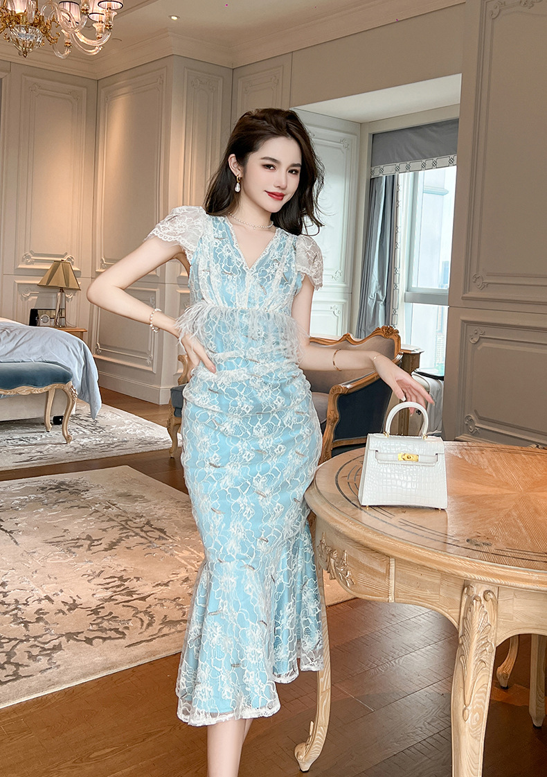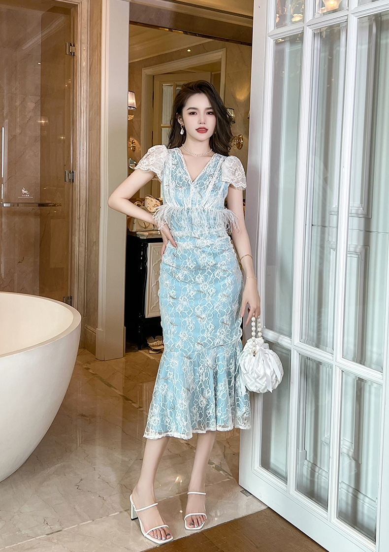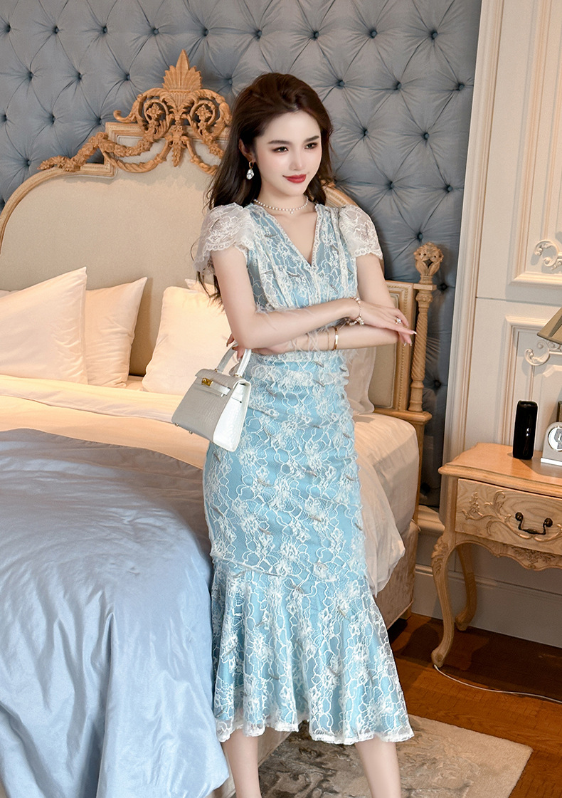 Chiếc đầm ôm body dáng đuôi cá cho nữ, điểm nhấn từ cổ chữ V cùng tay bồng duyên dáng. Viền ren tinh tế kết hợp hạt ngọc tr giả và đường viền mềm mại tạo nên vẻ đẹp dịu dàng. Chất vải co giãn nhẹ mang lại sự thoải mái khi mặc. Sản phẩm phù hợp cho những buổi gặp mặt hoặc dạo phố. Giặt tay và phơi trong bóng râm để giữ form vải và chi tiết trang trí. | Tên sản phẩm: Váy Đầm Liền Thân Nữ Chất Liệu Ren Tay Phồng Kiểu Đuôi Cá Cổ Chữ V Hàng Mùa Hè - Thời Trang Nữ | Mã sản phẩm: K7847 - Giá: 1.620.000đ | Mã nhà sản xuất: CHDG-G05Hình ảnh sản phẩm