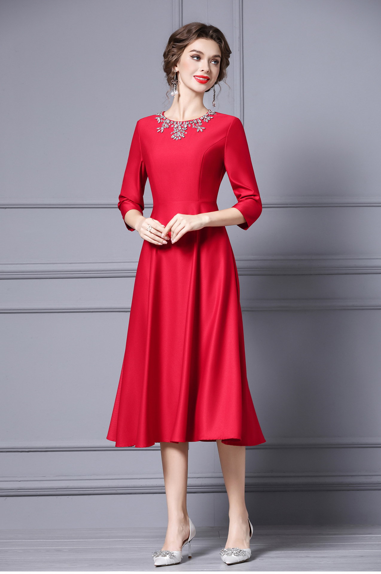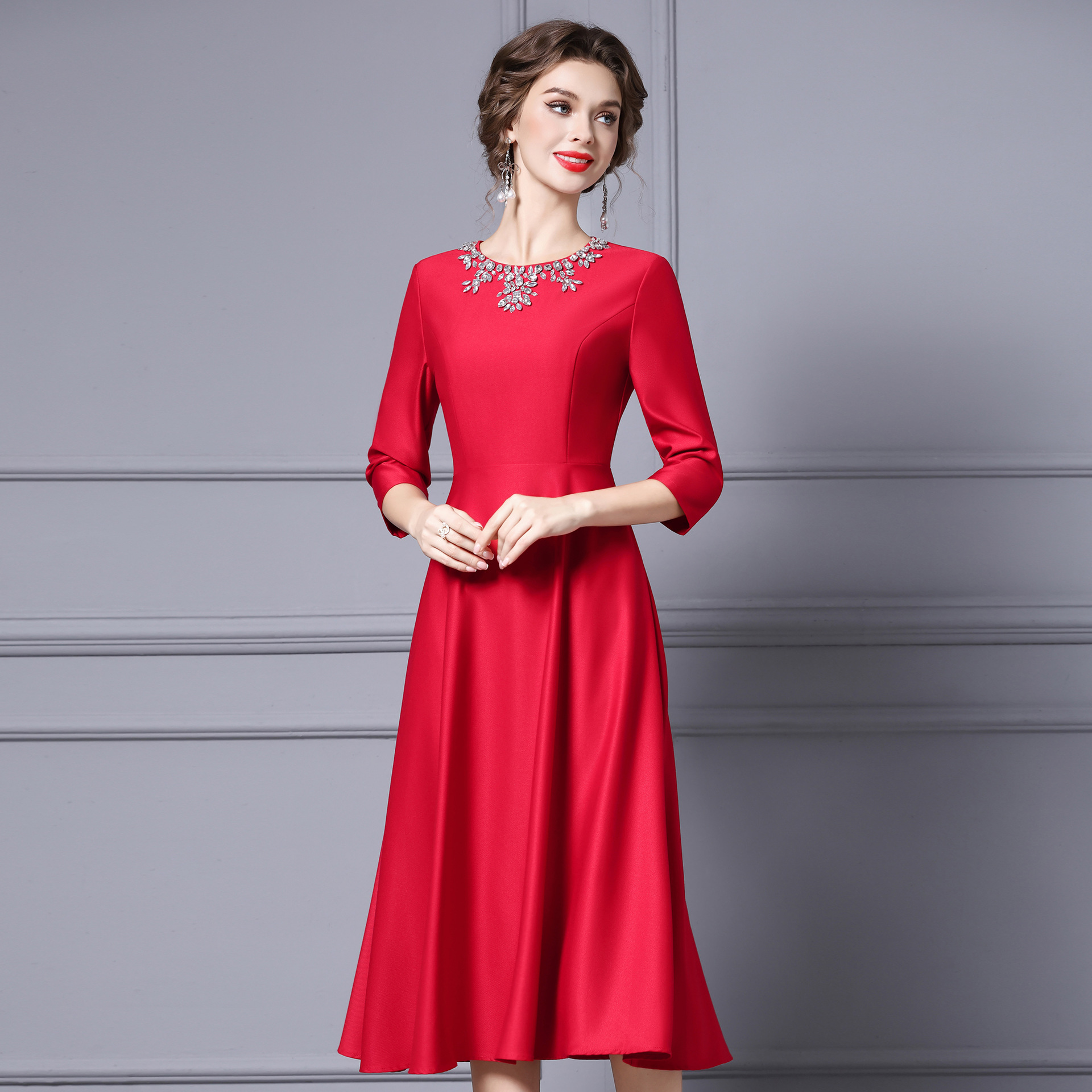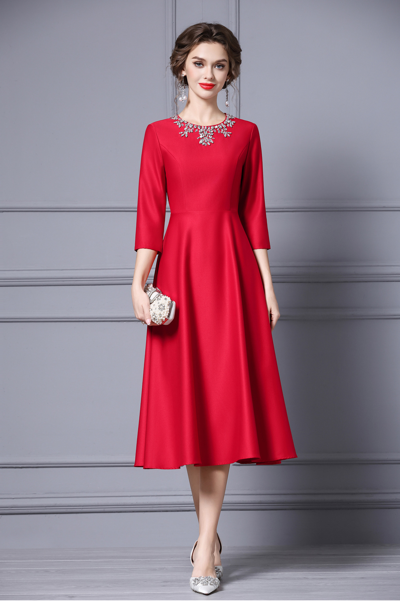 Chiếc váy dành cho những dịp quan trọng, với thiết kế dáng chữ A thanh lịch, dài qua gối phù hợp cho người có chiều cao. Trang trí tinh tế bằng các hạt đá lấp lánh gắn cẩn thận. Váy có màu đỏ nổi bật, được thiết kế cho mùa thu. Sản phẩm dễ dàng phối cùng giày cao gót và túi xách. Giữ gìn bằng cách giặt tay nhẹ nhàng và bảo quản nơi khô ráo. | Tên sản phẩm: Váy Đầm Liền Thân Nữ Dài Quá Gối Hàng Mùa Xuân Thu Đông - Thời Trang Nữ | Mã sản phẩm: A9845 - Giá: 2.870.000đ | Mã nhà sản xuất: SHDAP-G06Hình ảnh sản phẩm