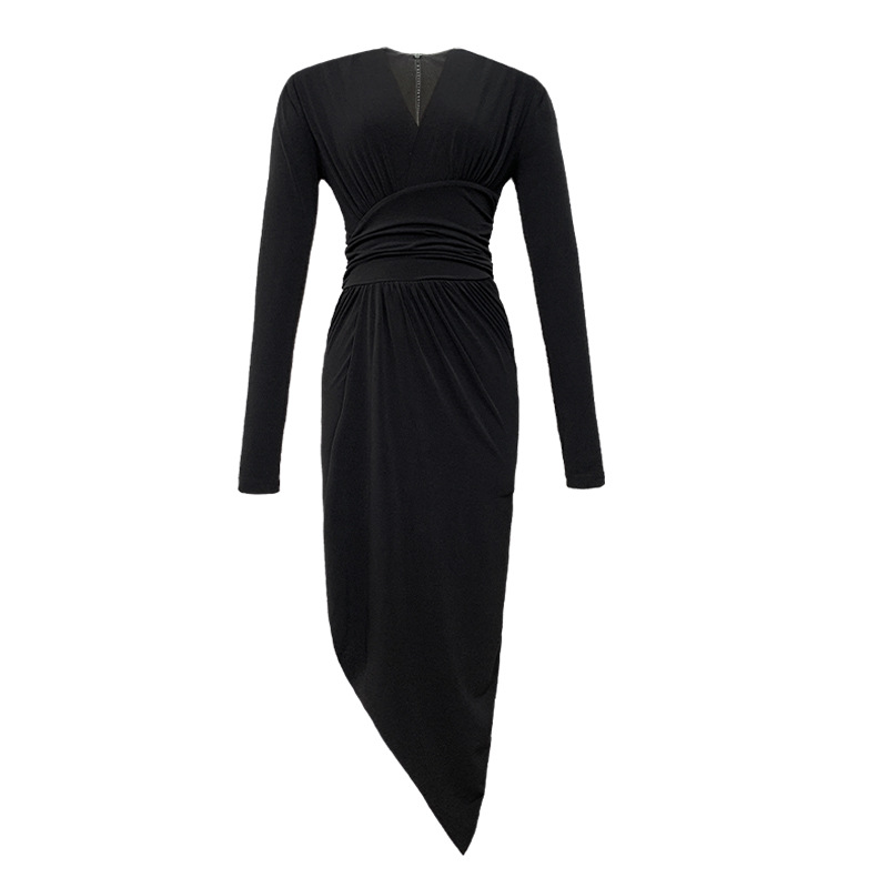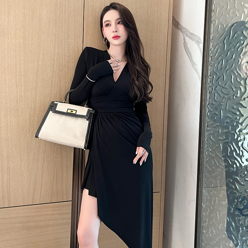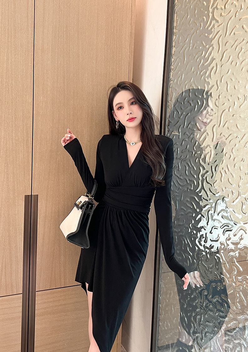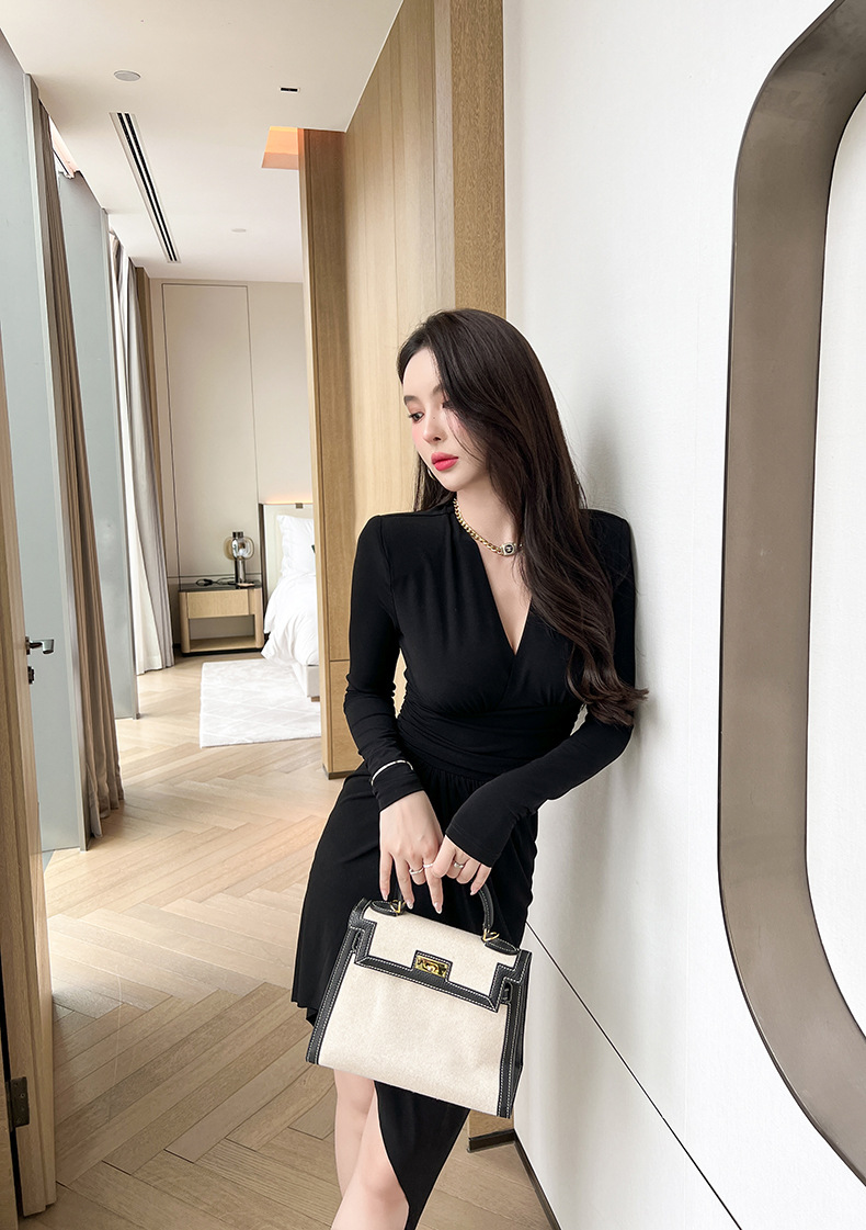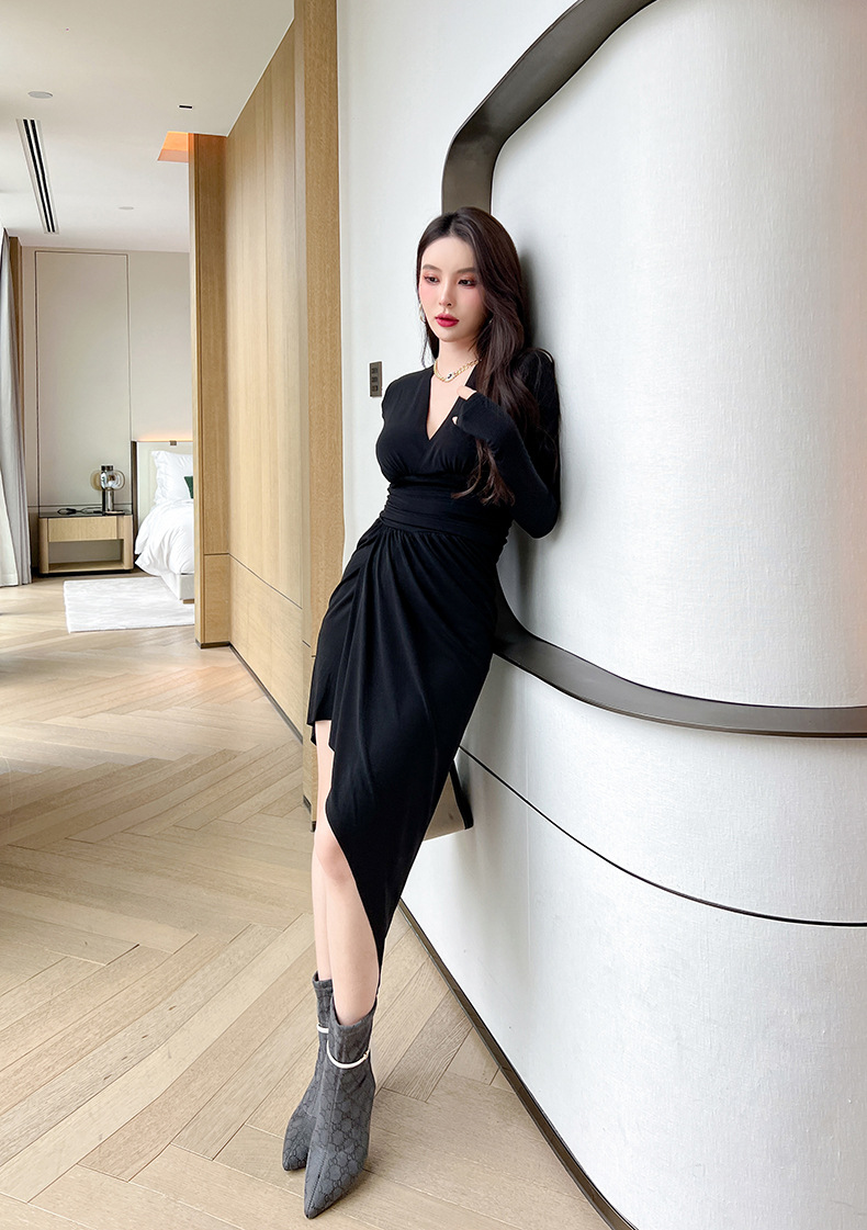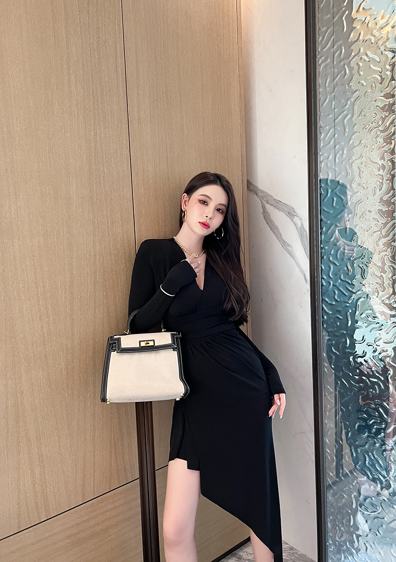 Chiếc đầm này có thiết kế cổ chữ V tạo điểm nhấn, giúp tôn dáng người mặc. Kiểu dáng ôm vừa phải và đường cắt xẻ không đều mang đến nét thời thượng, phóng khoáng. Đây là mẫu đầm ngắn cơ bản màu đen, dễ dàng phối hợp với nhiều loại phụ kiện khác nhau. Bạn có thể mặc đi làm, dự tiệc hoặc những dịp gặp mặt thông thường. Chất vải co giãn nhẹ mang lại sự thoải mái khi vận động. | Tên sản phẩm: Váy Đầm Liền Thân Nữ Dáng Ôm Cổ Chữ V Hàng Mùa Xuân Thu Đông - Thời Trang Nữ | Mã sản phẩm: B6956 - Giá: 1.050.000đ | Mã nhà sản xuất: CHDG-G03Hình ảnh sản phẩm