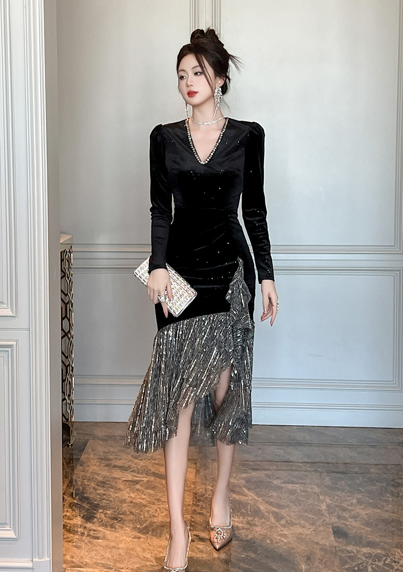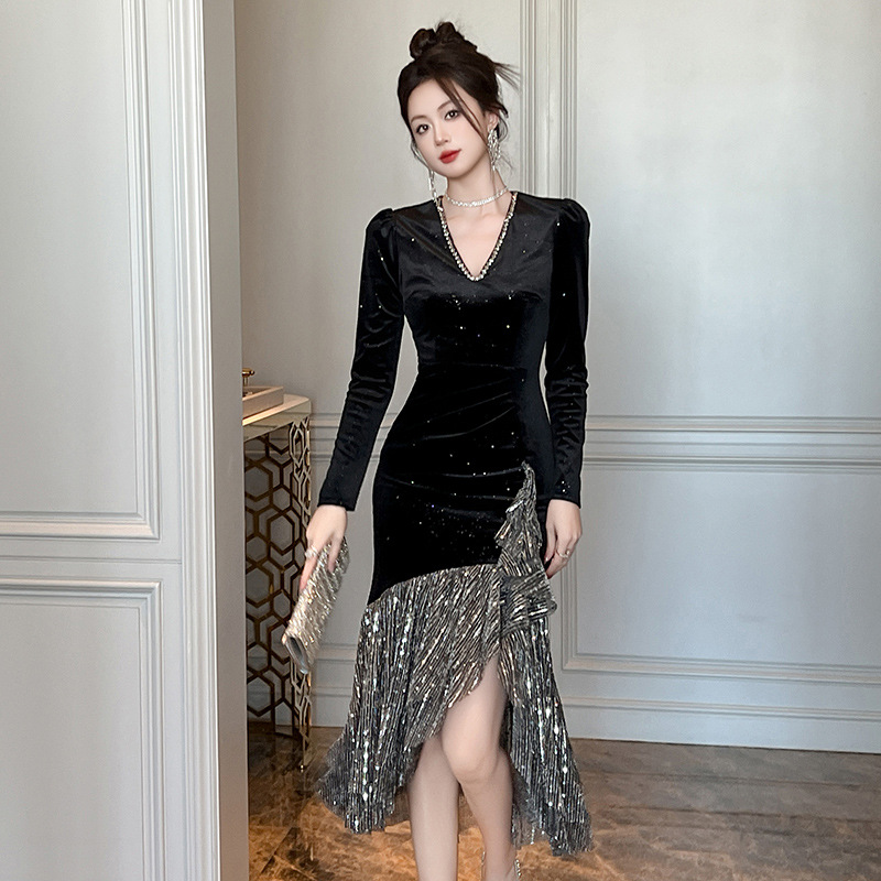 Chiếc đầm dự tiệc cuối năm, thiết kế cho thu đông 2025 với phong cách Pháp thanh lịch. Cổ chữ V tôn dáng, form ôm body giúp tôn lên những đường nét cơ thể. Điểm nhấn độc đáo nằm ở phần viền váy được cắt xẻ không đều, tạo nên sự mới mẻ và năng động. Chất vải mềm mại, thoải mái vận động nhẹ trong các buổi liên hoan. Dễ dàng phối cùng giày cao gót và một vài món trang sức nhỏ để hoàn thiện bộ trang phục. | Tên sản phẩm: Váy Đầm Liền Thân Nữ Dáng Ôm Cổ Chữ V Hàng Mùa Xuân Thu Đông - Thời Trang Nữ | Mã sản phẩm: B0576 - Giá: 1.350.000đ | Mã nhà sản xuất: CHDG-G04Hình ảnh sản phẩm