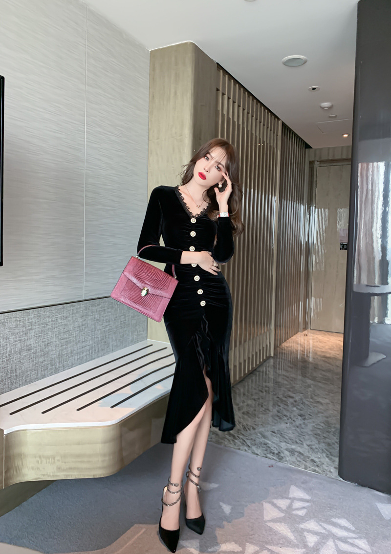 Chiếc đầm dáng bó eo, điểm nhấn là hàng cúc đơn phía trước cùng phần tà xòe uyển chuyển như đuôi cá. Chất liệu nhung mềm mại mang đến cảm giác dễ chịu và ấm áp, rất phù hợp cho thời tiết mát mẻ. Kiểu dáng ôm sát tôn lên những đường nét cơ thể một cách tinh tế. Có thể phối cùng giày cao gót và túi xách nhỏ cho những buổi tiệc hoặc gặp mặt. | Tên sản phẩm: Váy Đầm Liền Thân Nữ Kiểu Đuôi Cá Hàng Mùa Xuân Thu Đông - Thời Trang Nữ | Mã sản phẩm: C1799 - Giá: 990.000đ | Mã nhà sản xuất: CHDG-G03Hình ảnh sản phẩm