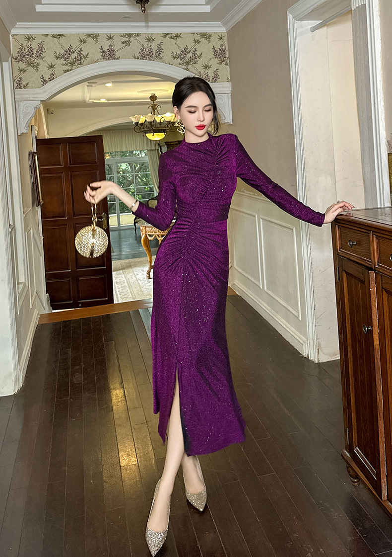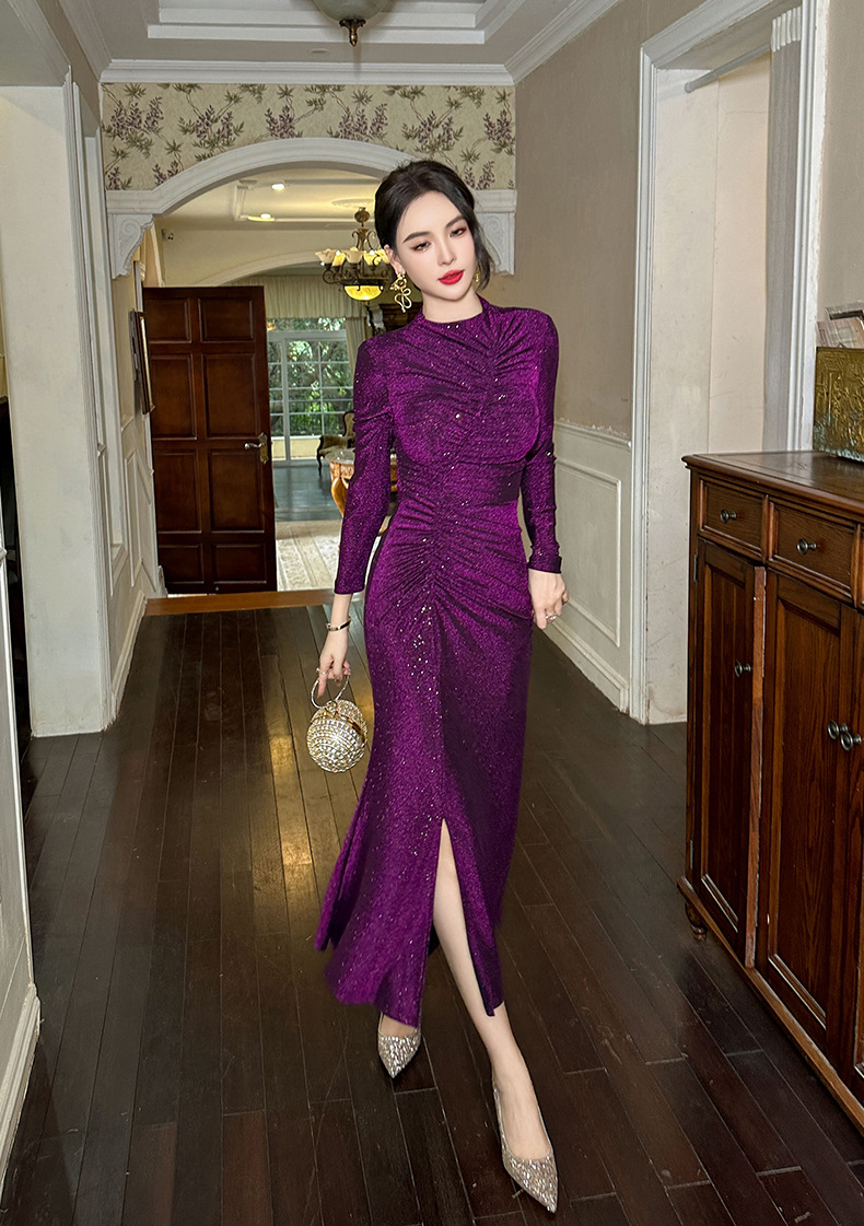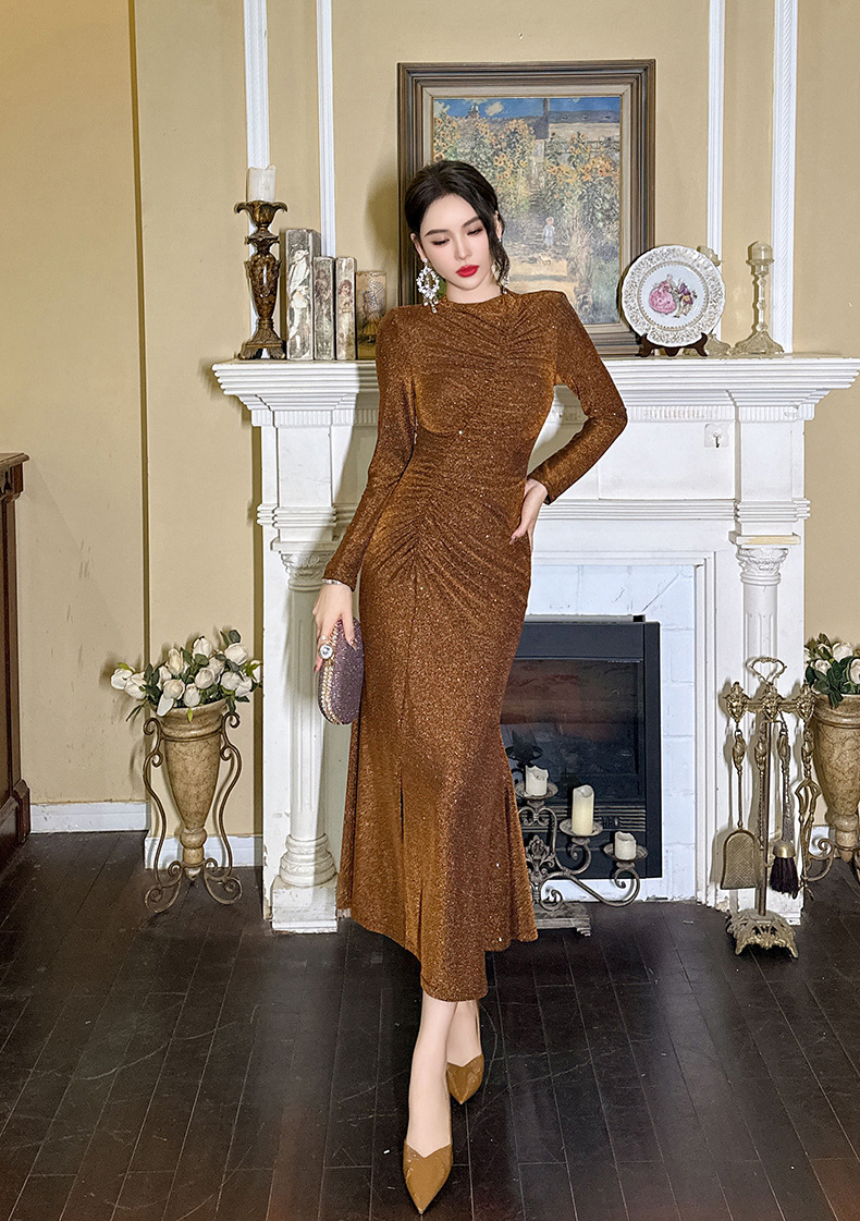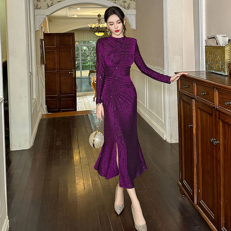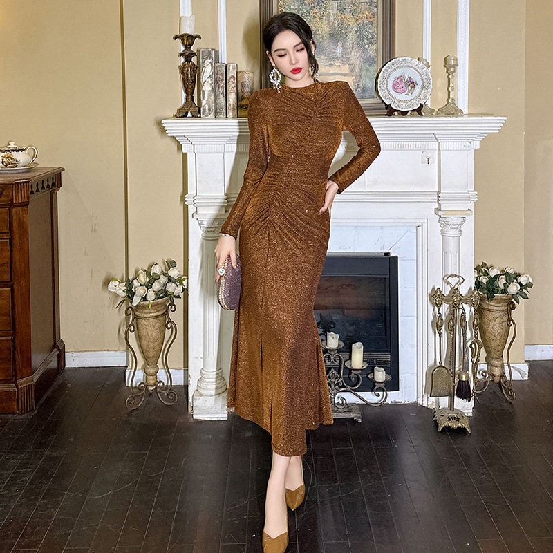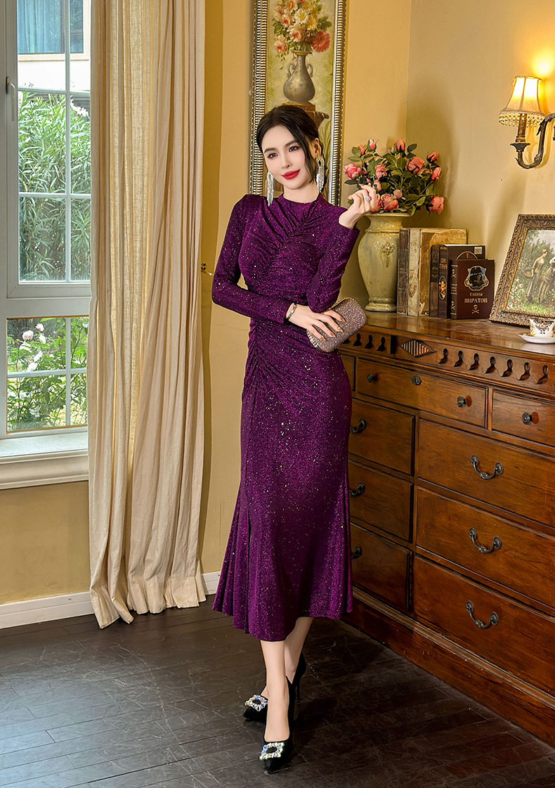 Đầm thiết kế theo phong cách xưa, dáng đuôi cá thanh lịch. Chất vải có pha ánh nhẹ tạo điểm nhấn tinh tế. Các đường xếp ly khéo léo giúp che bụng hiệu quả, ôm nhẹ phần hông và xẻ nhẹ tà tạo dáng đi uyển chuyển. Kiểu dáng ôm body nhẹ nhàng, tôn dáng người mặc. Phù hợp cho nhiều dịp đi chơi, gặp gỡ. Mặc kèm giày cao gót hoặc sandal để hoàn thiện set đồ. | Tên sản phẩm: Váy Đầm Liền Thân Nữ Kiểu Đuôi Cá Hàng Mùa Xuân Thu Đông Phục Cổ Cổ Điển - Thời Trang Nữ | Mã sản phẩm: B0567 - Giá: 1.120.000đ | Mã nhà sản xuất: CHDG-G04Hình ảnh sản phẩm