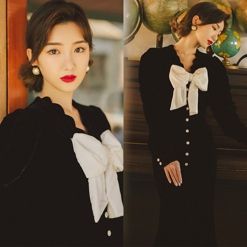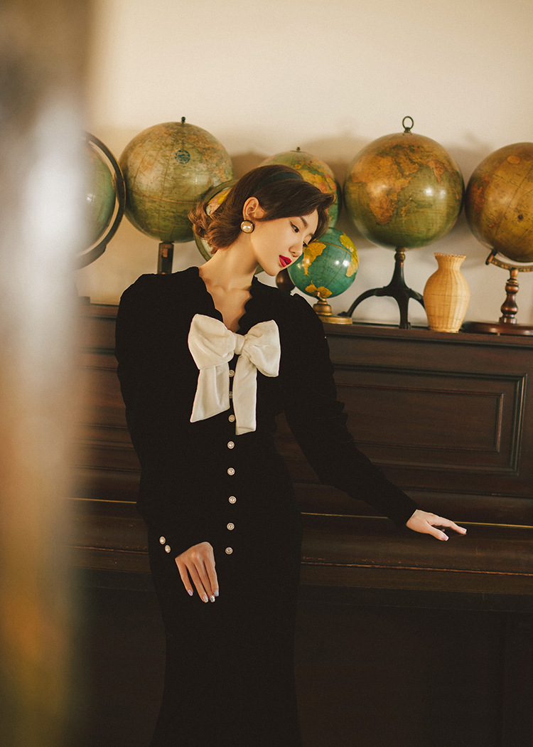 Chiếc đầm dáng dài mang phong cách cổ điển Pháp, lấy cảm hứng từ những mẫu thiết kế thanh lịch ngày trước. Chất vải nhung mềm mại, tạo cảm giác dễ chịu và ấm áp cho những ngày tiết trời se lạnh. Điểm nhấn là chi tiết nơ xinh xắn ở phần cổ, làm tăng thêm nét nữ tính. Kiểu dáng phù hợp để mặc đi làm, dạo phố hay dự những buổi hẹn gặp mặt. Có thể phối cùng giày cao gót hoặc giày đế bằng đều rất hợp. | Tên sản phẩm: Váy Đầm Liền Thân Nữ Thắt Nơ Bướm Hàng Mùa Xuân Thu Đông Phục Cổ Cổ Điển - Thời Trang Nữ | Mã sản phẩm: T4623 - Giá: 1.240.000đ | Mã nhà sản xuất: GUDG-G04Hình ảnh sản phẩm
