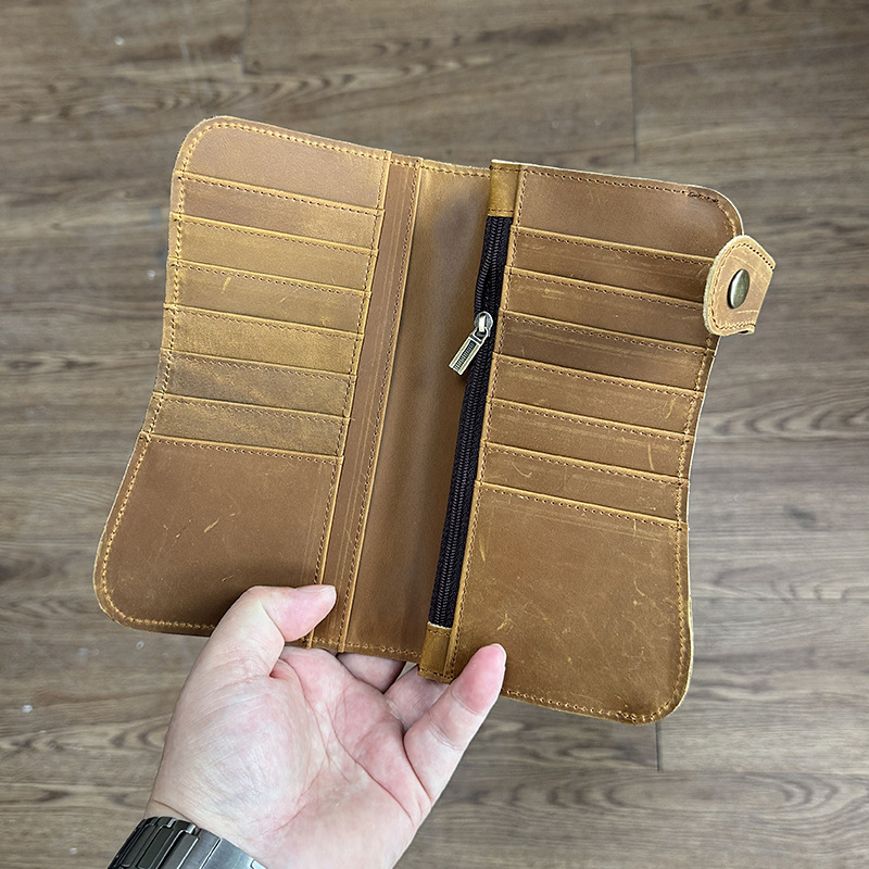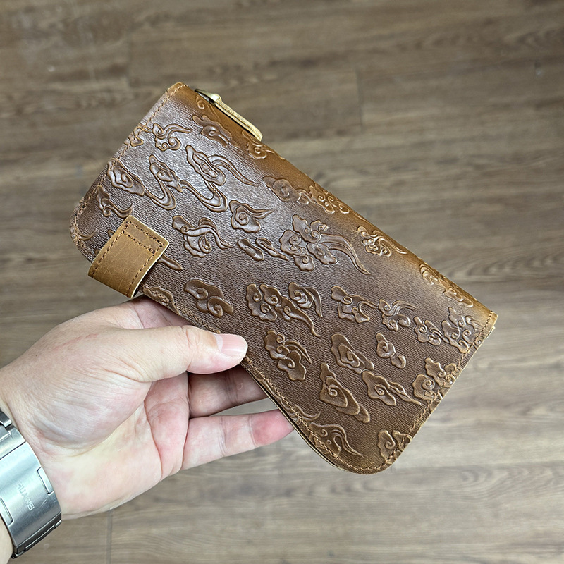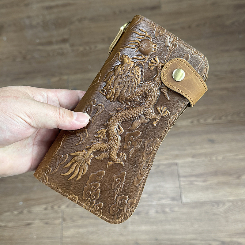 Chiếc ví nam này mang phong cách hoài cổ với họa tiết con rồng nổi bật. Chất liệu bằng da thật, loại da có vân tự nhiên tạo vẻ đẹp mạnh mẽ. Thiết kế dài vừa tay, bên trong có ngăn đựng tiền và khe cho thẻ. Ví còn tích hợp thêm vòng khoá chìa khóa tiện lợi. Bạn chỉ cần xếp tiền vào các ngăn, dùng khóa kéo đóng lại là có thể mang theo dễ dàng. | Tên sản phẩm: Ví Bóp Cầm Tay Nam Chất Liệu Da Bò Phục Cổ Cổ Điển - Túi Xách Ví Nam | Mã sản phẩm: A4633 - Giá: 610.000đ | Mã nhà sản xuất: GUDEA-G02Hình ảnh sản phẩm
