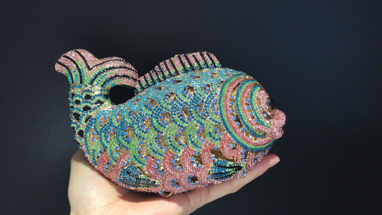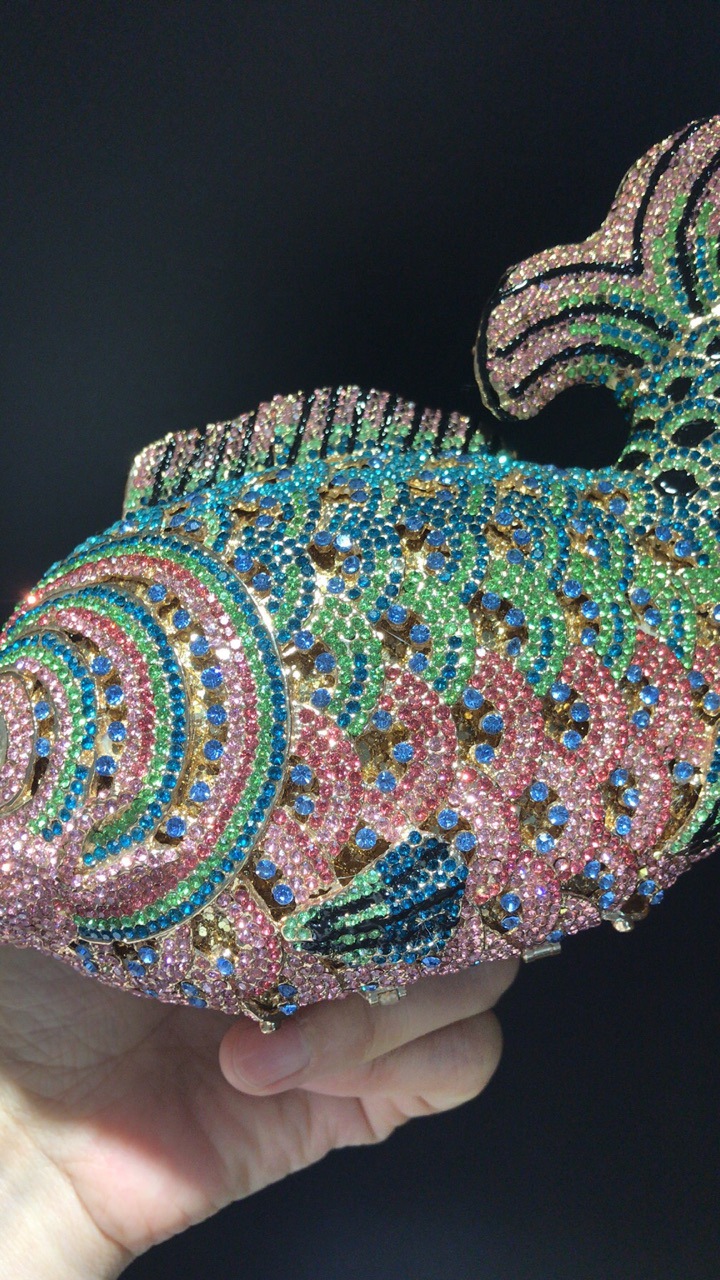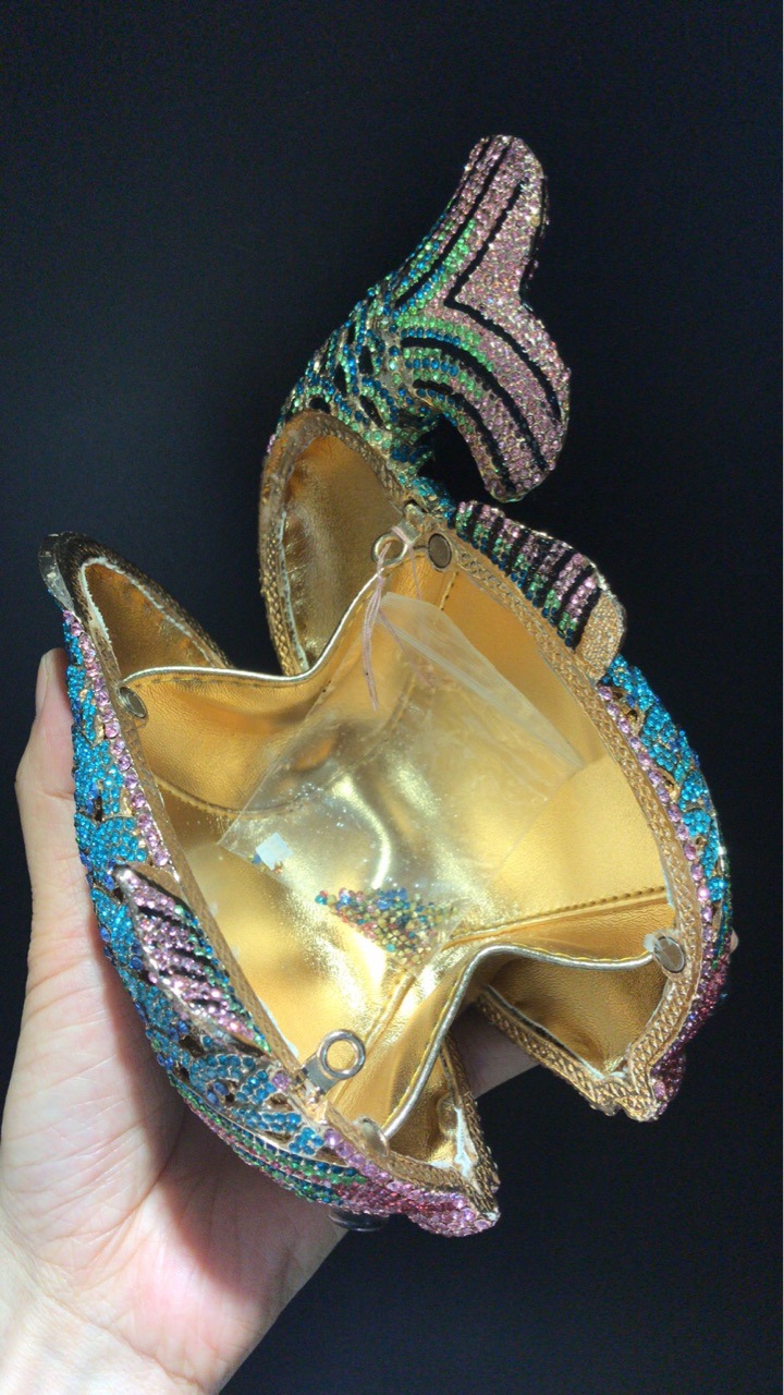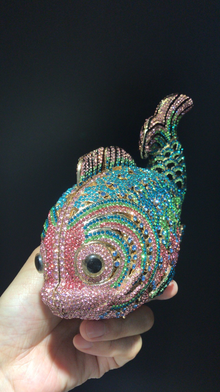 Chiếc túi cầm tay này có kiểu dáng ngộ nghĩnh hình chú cá vàng, được đính kín những viên đá lấp lánh tinh xảo. Dáng túi thanh lịch, phù hợp để mang trong các buổi tiệc tối hay sự kiện. Chất liệu cứng cáp giúp túi giữ được hình dáng chuẩn đẹp. Bạn có thể cầm tay hoặc kẹp vào nách một cách dễ dàng. Túi đủ rộng để đựng vừa điện thoại, son môi và một số vật dụng cá nhân cần thiết. | Tên sản phẩm: Ví Bóp Cầm Tay Nữ - Túi Ví Nữ | Mã sản phẩm: K1892 - Giá: 1.920.000đ | Mã nhà sản xuất: PURYRM-G05Hình ảnh sản phẩm
