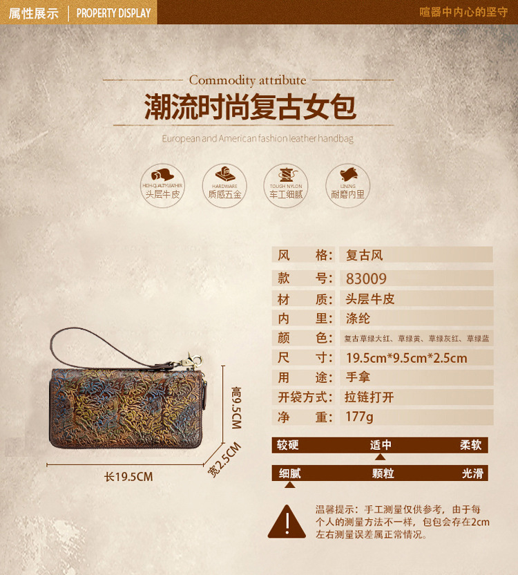 Chiếc ví cầm tay này được làm từ chất da bò tự nhiên, mang đến cảm giác mềm mại và bền chắc. Kiểu dáng dài với nhiều ngăn đựng thẻ, giúp bạn sắp xếp tiền mặt và thẻ một cách gọn gàng. Thiết kế phong cách cổ điển, dễ dàng kết hợp với nhiều trang phục. Bạn có thể cầm tay hoặc cho vào túi xách lớn khi di chuyển. Sản phẩm tiện lợi cho việc sử dụng hằng ngày. | Tên sản phẩm: Ví Bóp Cầm Tay Nữ Chất Liệu Da Bò Phong Cách Âu Mỹ - Túi Ví Nữ | Mã sản phẩm: A4008 - Giá: 720.000đ | Mã nhà sản xuất: GUDNG-G02Hình ảnh sản phẩm